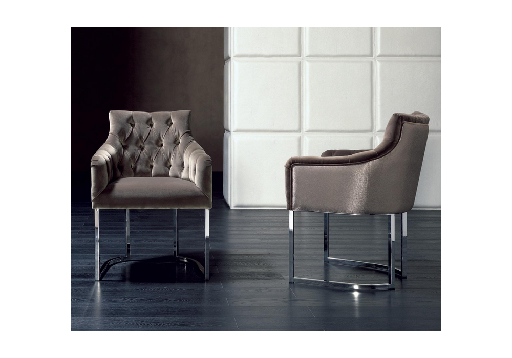 Itaca firmata da Rugiano è una sedia disponibile con rivestimento in differenti finiture con struttuta in acciaio colore cromato o bronzo.