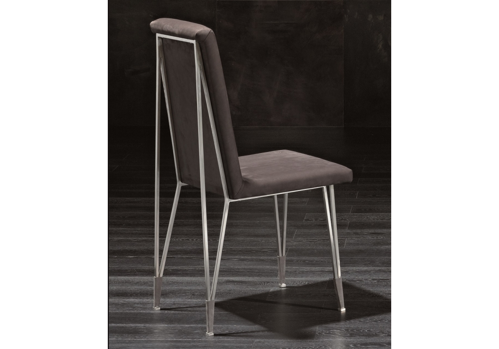 Yuki firmata da Rugiano è una sedia con struttura in acciaio nella finitura ottone bronzato e seduta con rivestimento in pelle in differenti finiture.