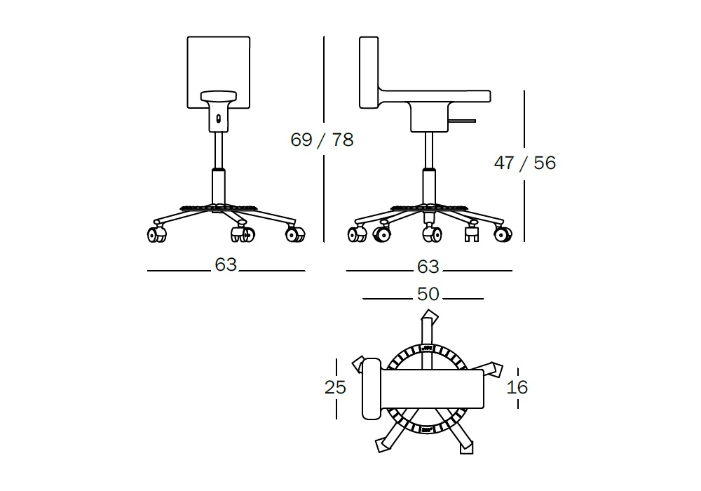 360° Chair firmata da Konstantin Grcic per Magis è una sedia girevole su ruote. Regolabile in altezza con pistone a gas, struttura in acciaio verniciato con resina epossidica. Poggiapiedi in pressofusione di alluminio. Sedile in poliuretano integrale autoportante.