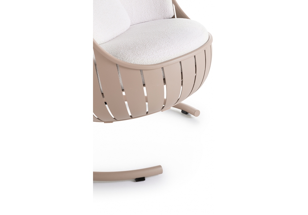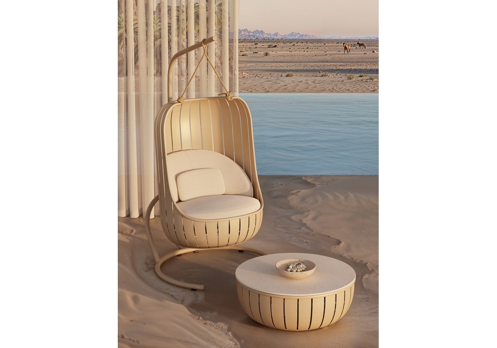 Arena Poltrona Sospesa firmata da Søren Rose presenta una struttura in alluminio verniciato a polvere, corda intrecciata in poliestere e seduta, schienale e cuscini in gomma poliuretanica e fibra di poliestere con tessuto idrorepellente. Peso massimo consigliato per un'altalena sospesa a una struttura: 150 kg. Disponibile in diverse finiture.