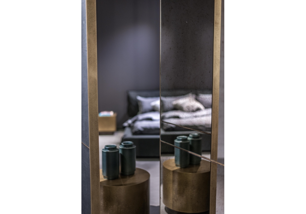 Oddo firmato da Baxter P. è un separé bifacciale con struttura girevole in ottone anticato composta da un lato in vetro specchiato anticato e un lato con rivestimento in pelle. Disponibile in due range di altezza.