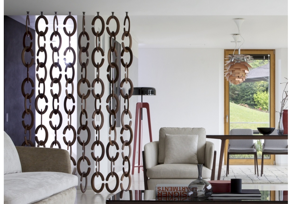 Cozy firmato da T. Colzani per Porada è un separè modulare con elementi in noce canaletta o tinto wengè. I ganci a soffitto in metallo grigio peltro possono essere fissati o lasciati mobili per permettere la rotazione del separè. È possibile creare diverse composizioni aggiungendo la quantità desiderata di singole unità e elementi di fissazione.