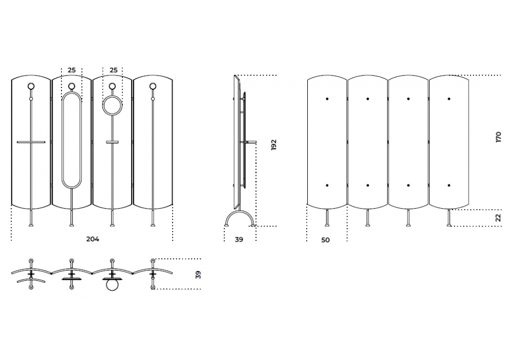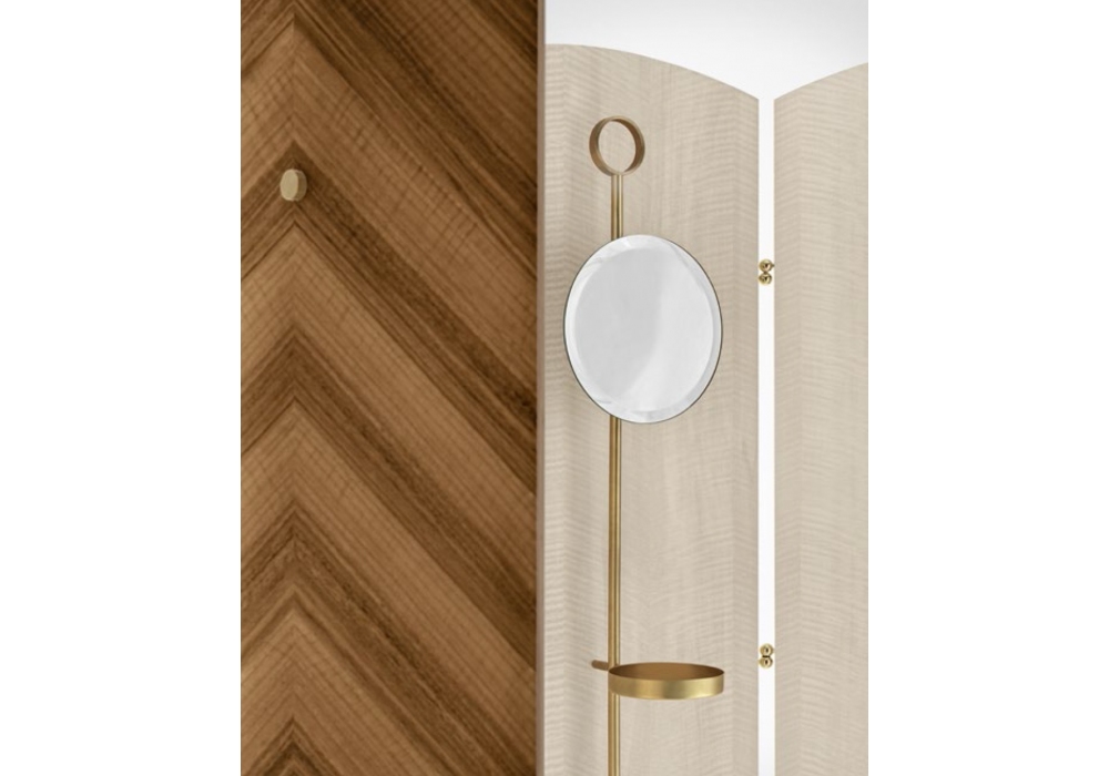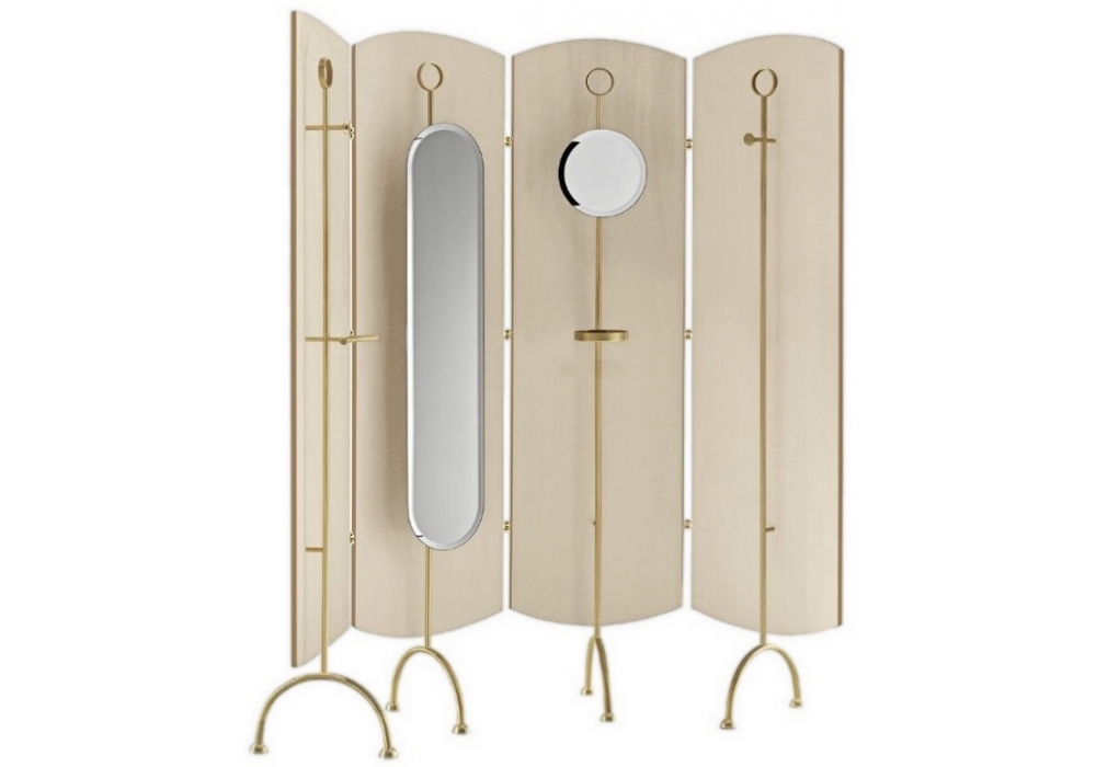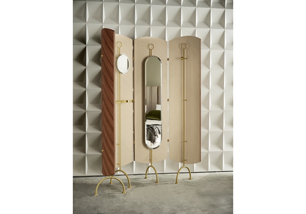 Shield firmato da Pietro Russo per Gallotti&Radice è un paravento composto da 4 moduli in legno curvato intarsiato Noce Colore Frisè o Acero Frisé grigio scuro. Interno in Tanganika bianco Frisè. Struttura e accessori in ottone satinato con specchi 6mm extralight bisellati.