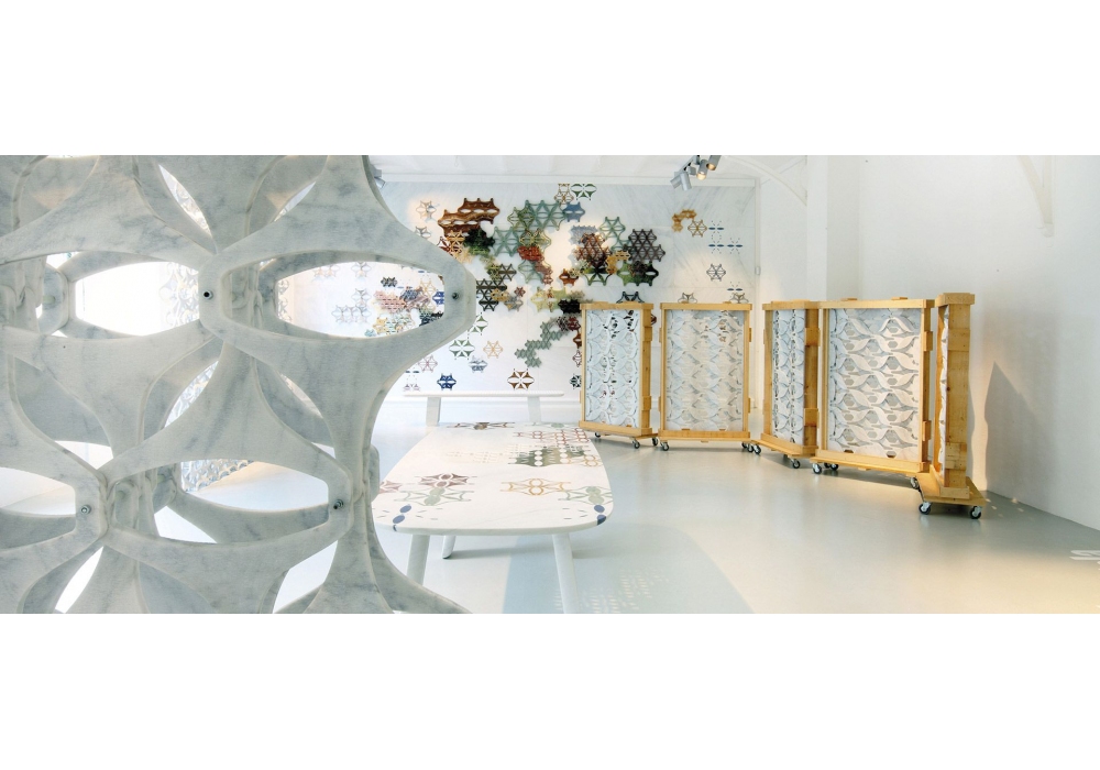 Lace firmato da Patricia Urquiola per Budri è un paravento modulare a traforo realizzato con elementi concavi e convessi in marmo Bianco Carrara. Disponibile in diverse dimensioni.