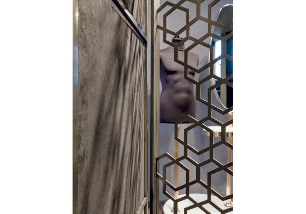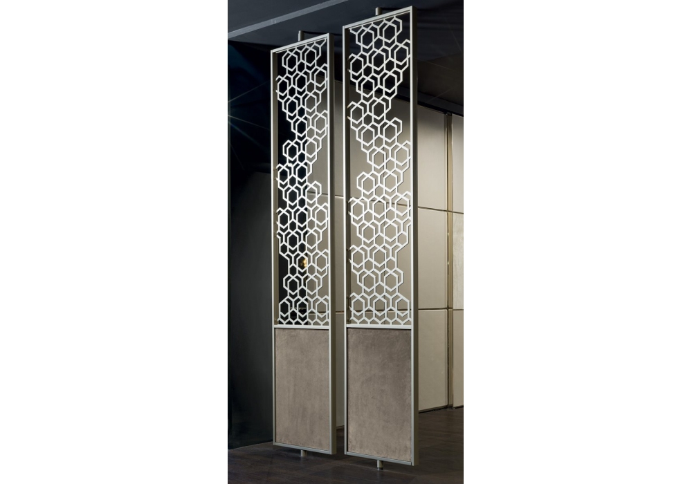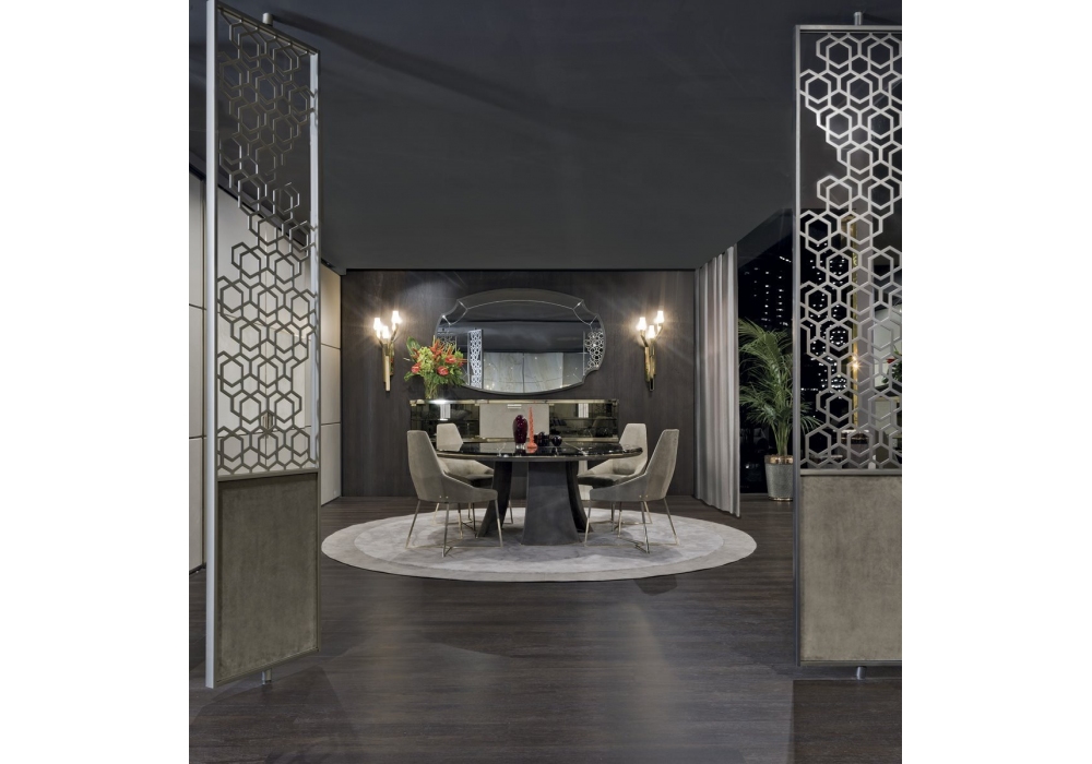 Rotary firmato da Giuseppe Iasparra per Longhi è un paravento con struttura in alluminio con decoro Sequence verniciato in finitura opaca e rivestimento in pelle. Disponibile nella versione mobile o a soffitto roteante.