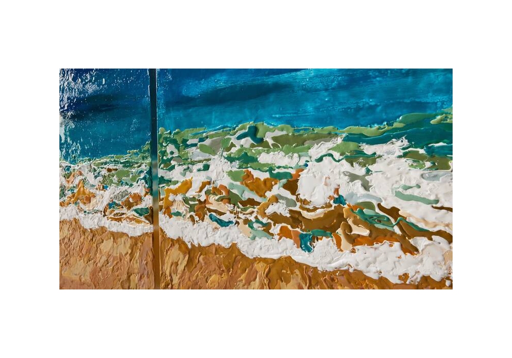 Paravento Risacca firmato da Gaetano Pesce per Cassina è un paravento composto da tre pannelli fissati su sei basamenti in ottone, sono realizzati tramite il colaggio in uno stampo in legno di una resina trasparente simile per l’effetto alla pittura a olio, in grado di restituire, impresso sul materiale, ogni gesto compiuto dall’artista, donando all’opera quella tridimensionalità che la rende unica. Nel piede del pannello centrale è inserita una cassa bluetooth.