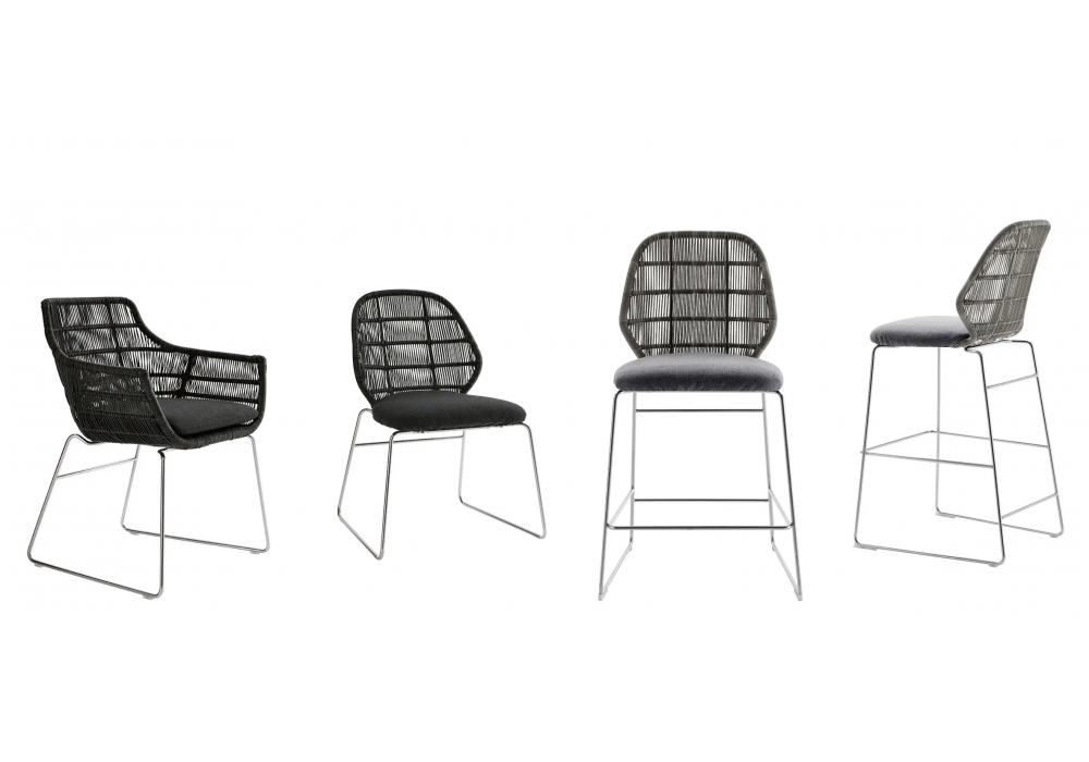 Crinoline firmato da Patricia Urquiola per B&B Italia Outdoor è uno sgabello disponibile in due dimensioni, realizzato con struttura in alluminio verniciato a polvere poliestere tortora, intreccio in polietilene tortora e base in acciaio inox lucido. Rivestimento del cuscino sedile e schienale in tessuto.