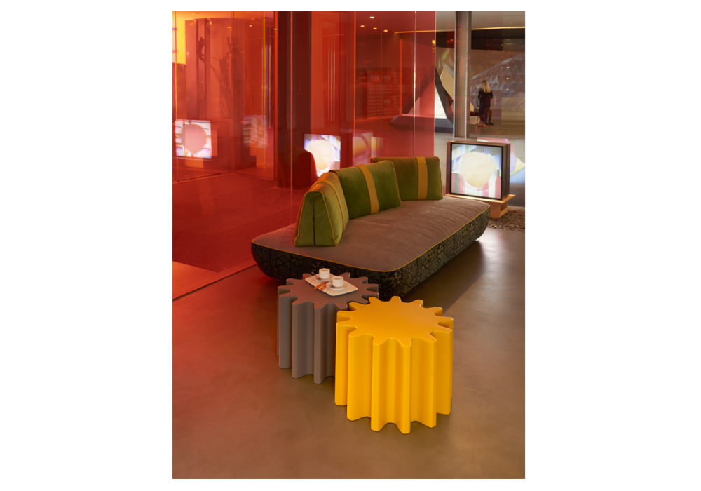 Gear firmato da Anastasia Ivanyuk per Slide è uno sgabello o tavolino realizzato in polietilene con la tecnica dello stampaggio rotazionale. Gear, essendo modulare su può utilizzare incastrando e sovrapponendo più elementi, come fossero veri ingranaggi, dando vita a composizioni giocose e colorate, per dare un tocco di originalità a tutte le tipologie di ambienti. Disponibile in diverse finiture.