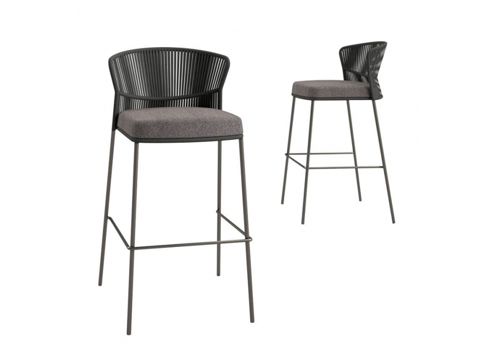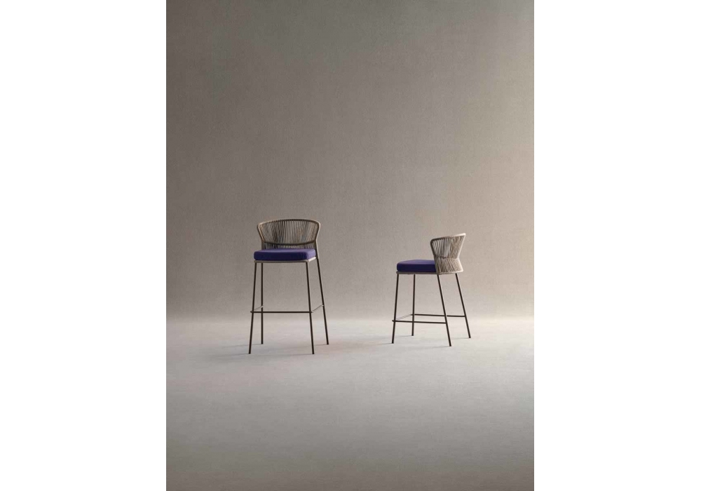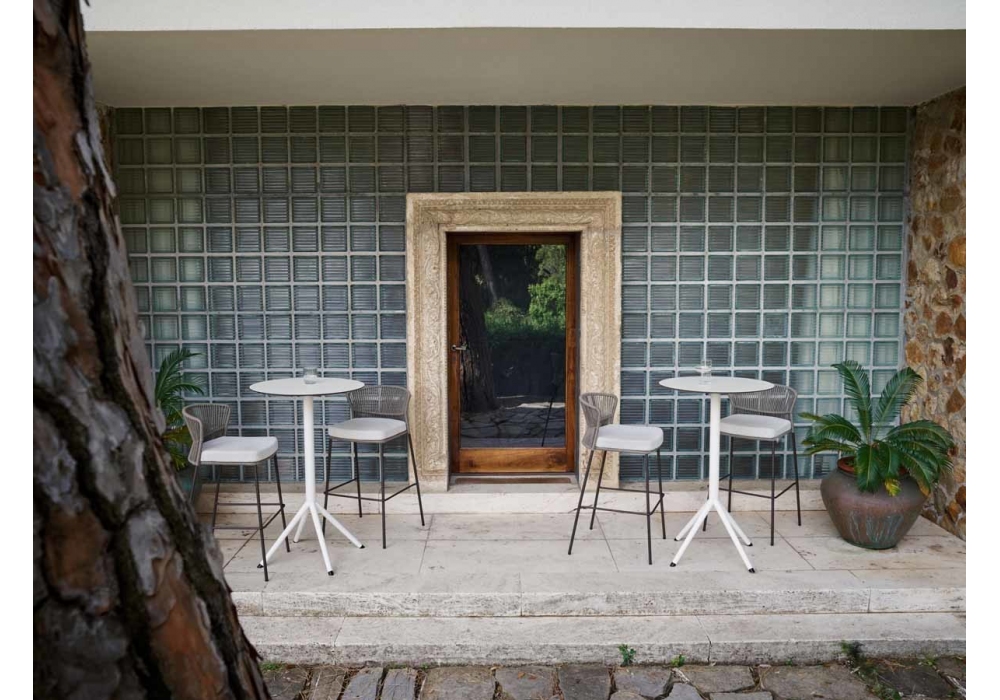 Ola firmato da Radice Orlandini per Potocco è uno sgabello outdoor strutturato interamente in metallo verniciato in differenti finiture. Seduta e schienale sono rivestiti con un intreccio in corda Fly da 8 mm. Ola è disponibile in due differenti dimensioni.