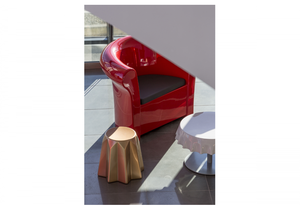 Pandoro firmato da Gianni Arnaudo per Slide è uno sgabello originale e divertente sgabello ispirato alla forma del famoso dolce veronese con una base a forma di stella a otto punte. Disponibile in differenti finiture