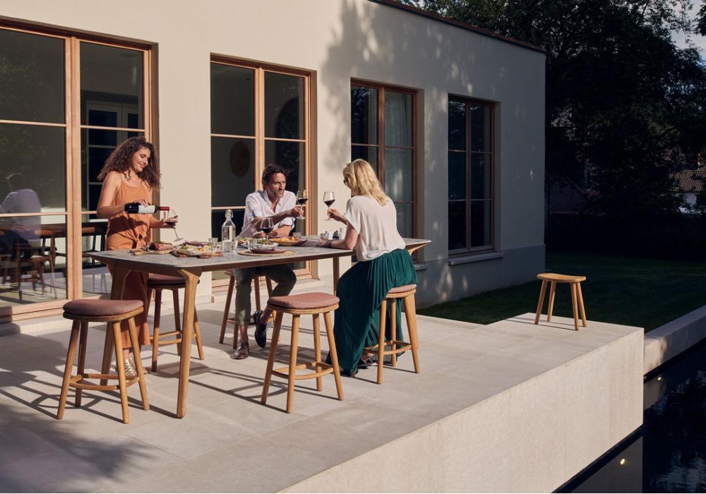 Solid firmato da Lionel Doyen per Manutti è uno sgabello con struttura in teak e rivestimento in differenti finiture. Disponibile in varie dimensioni.