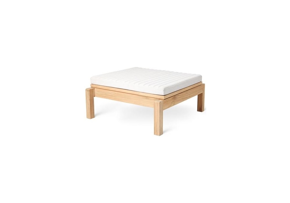 AH604F firmato da Alfred Homann per Carl Hansen & Søn è un poggiapiedi per esterno con telaio in legno massello di teak. Disponibile con o senza cuscino rivestito in tessuto Agora Life Oat 1760.