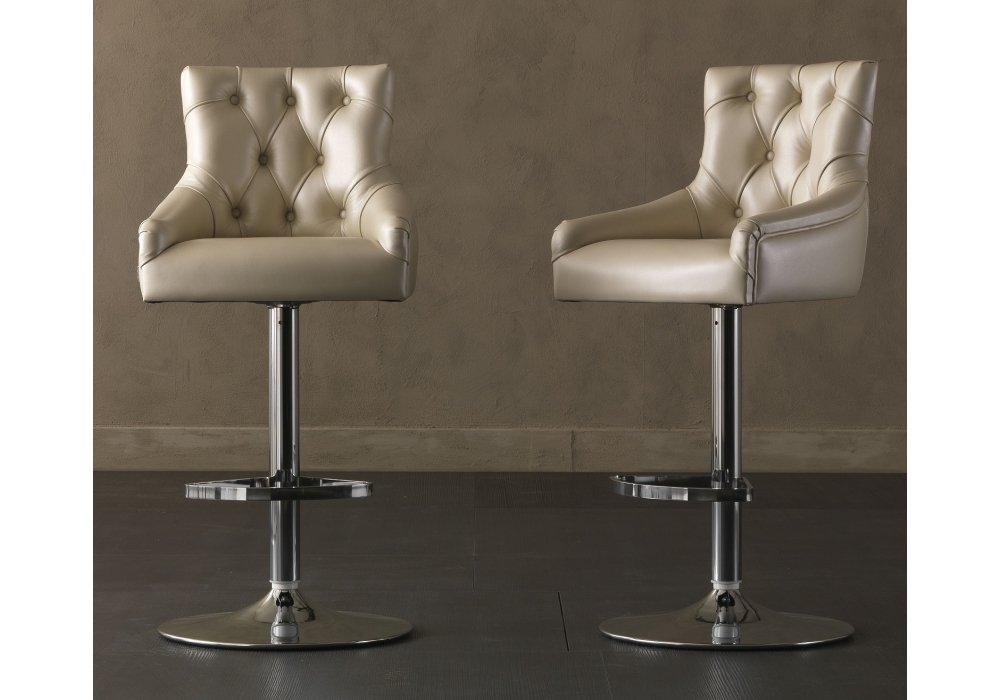 Itaca firmato da Rugiano è uno sgabello con base in acciaio e seduta rivestita in pelle o tessuto.