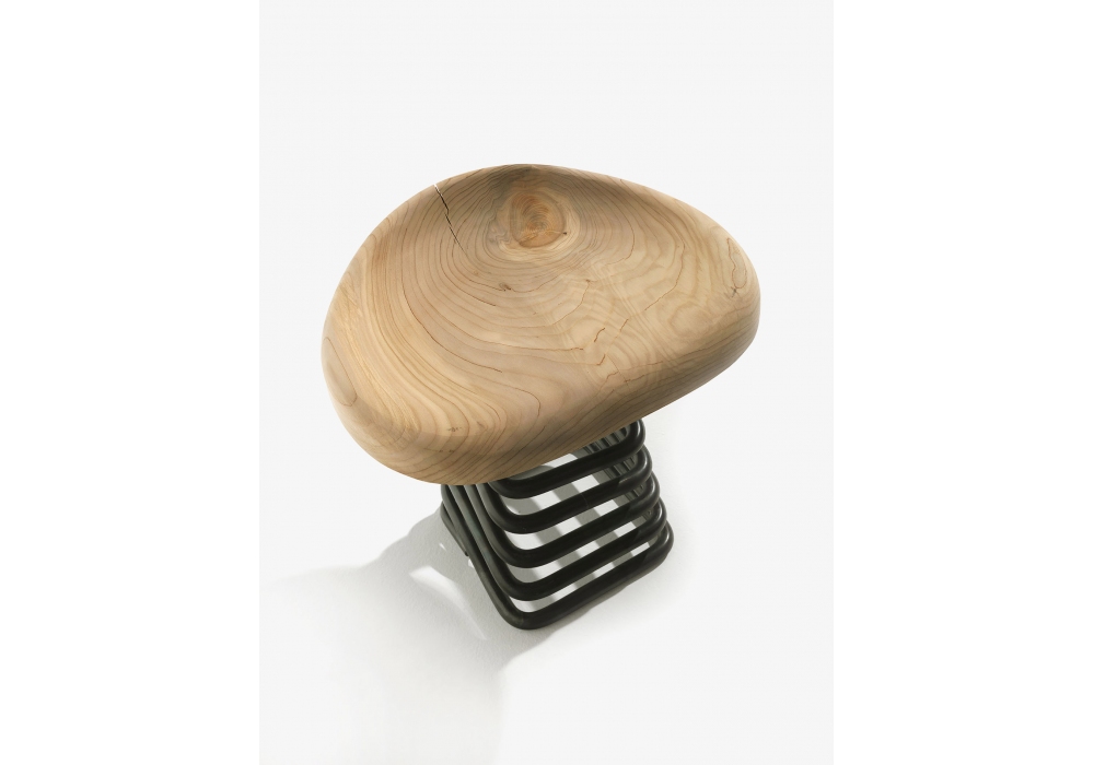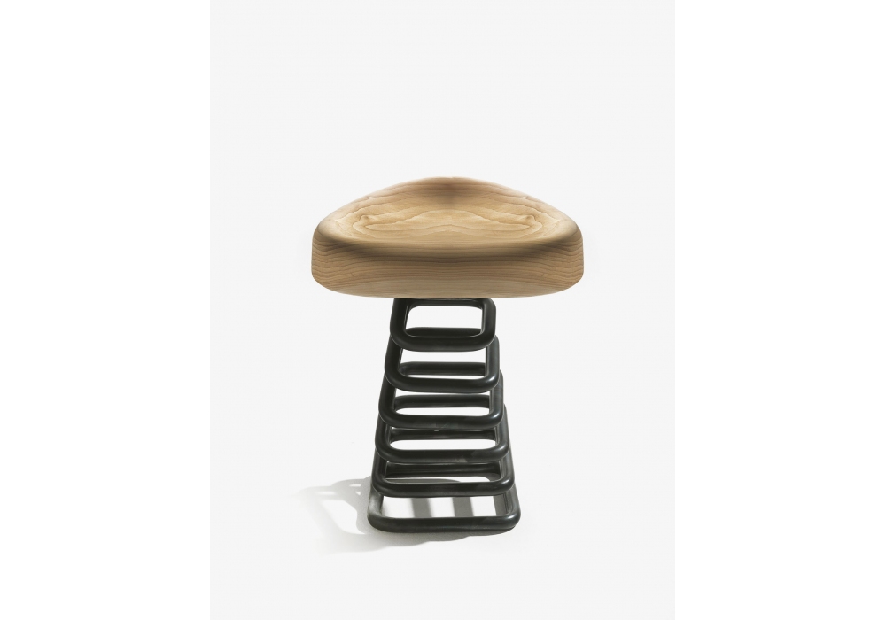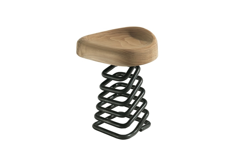 Molla firmato da Riva 1920 è uno sgabello composto da un sedile sagomato in legno massello sorretto da una molla quadrata che permette un movimento oscillatorio nelle varie direzioni.