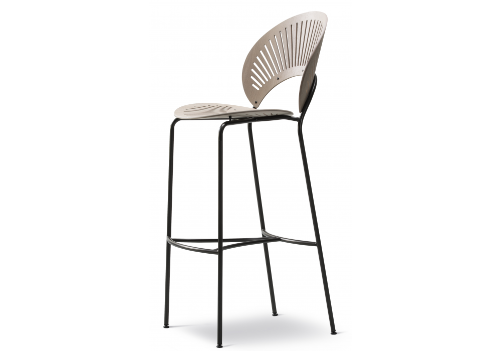 Trinidad firmato da Nanna Ditzel per Fredericia è un sgabello bar con struttura in tubo d'acciaio, schienale in compensato modellato con ritagli fresati a CNC. Sedile e schienale montati con rivetti.