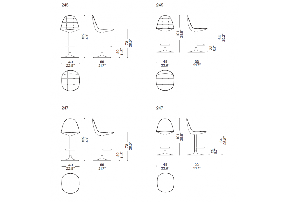 245/247 Caprice firmato da Philippe Starck per Cassina è uno sgabello disponibile in due differenti altezze. La base è realizzabile in tinta con la scocca o cromata lucida. Il poggiapiedi è sempre nella finitura cromata. Rivestimento frontale in pelle o tessuto.