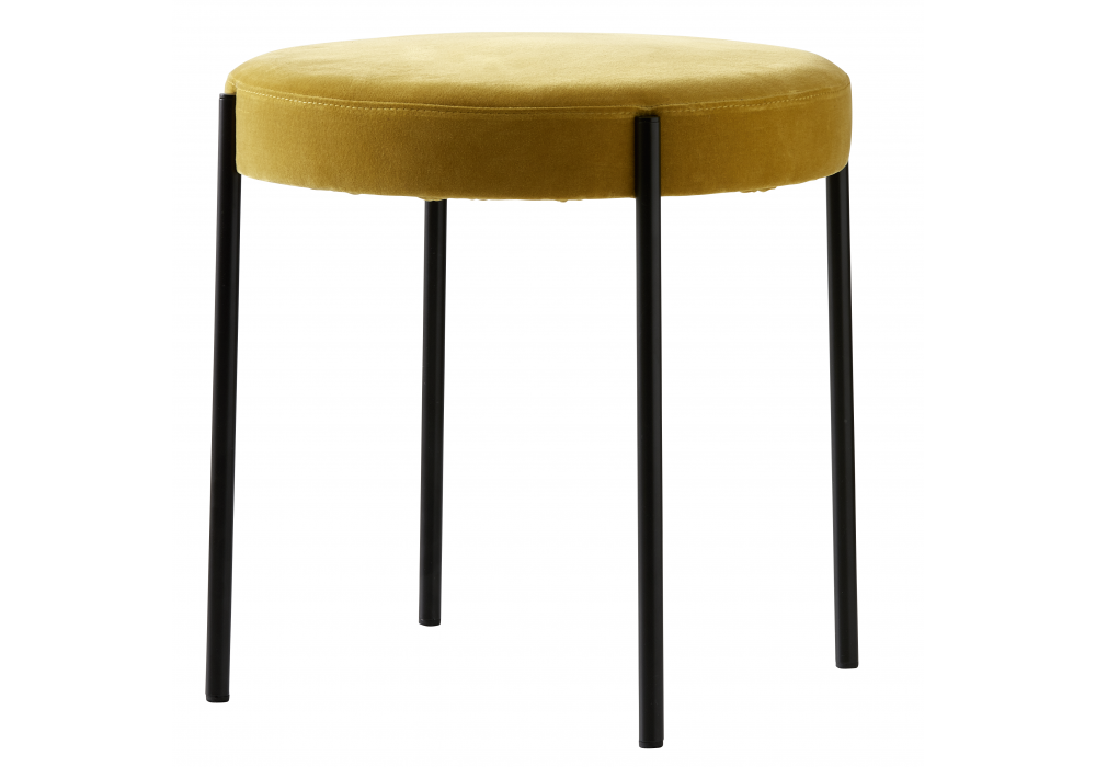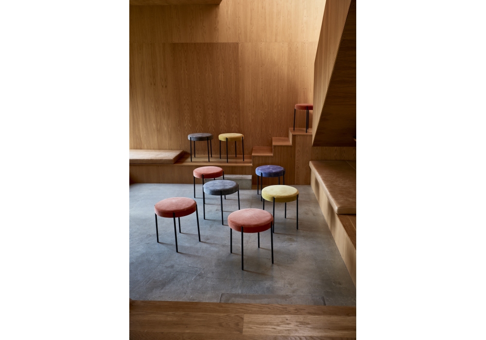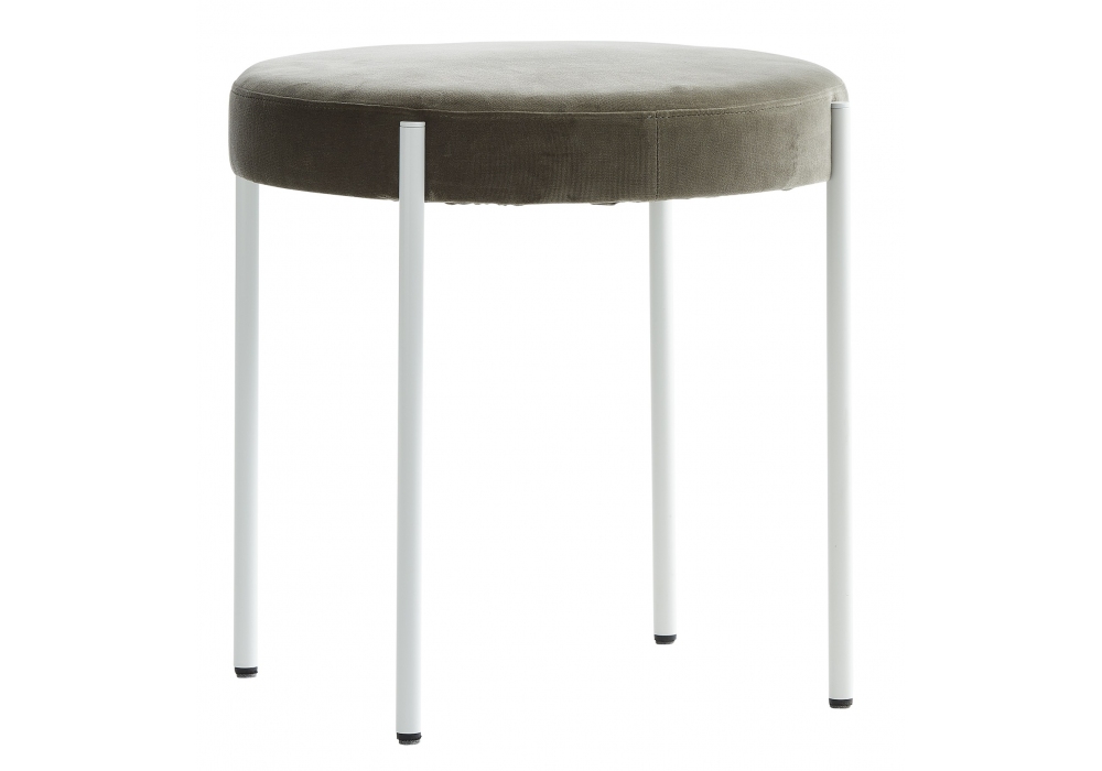 Series 430 firmato da Verner Panton per Verpan è uno sgabello impilabile completamente imbottito e rivestito in tessuto o pelle. Struttura in metallo verniciato nero, bianco o bordeaux e piedini in feltro.