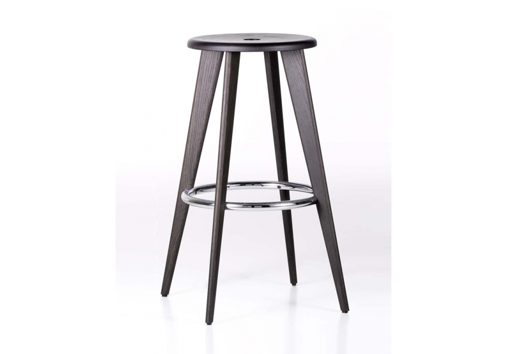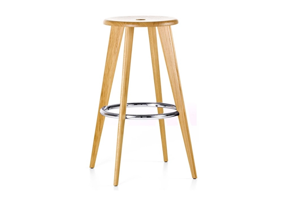 Tabouret Haut rappresenta una tipologia tradizionale di sgabelli da bar: la seduta viene sostenuta da gambe oblique. Un anello di collegamento rinforza la struttura e serve al contempo da poggiapiedi. I punti forti di Tabouret Haut sono l'aspetto sobrio, la chiarezza della struttura e le proporzioni armoniose. Tabouret Haut possiede un sedile in rovere massello, naturale o tinto scuro, legno naturale con smalto protettivo e gambe in rovere massello, naturale o tinto scuro, legno naturale con smalto protettivo. Poggiapiedi in tubolare d‘acciaio cromato, superficie antiscivolo.