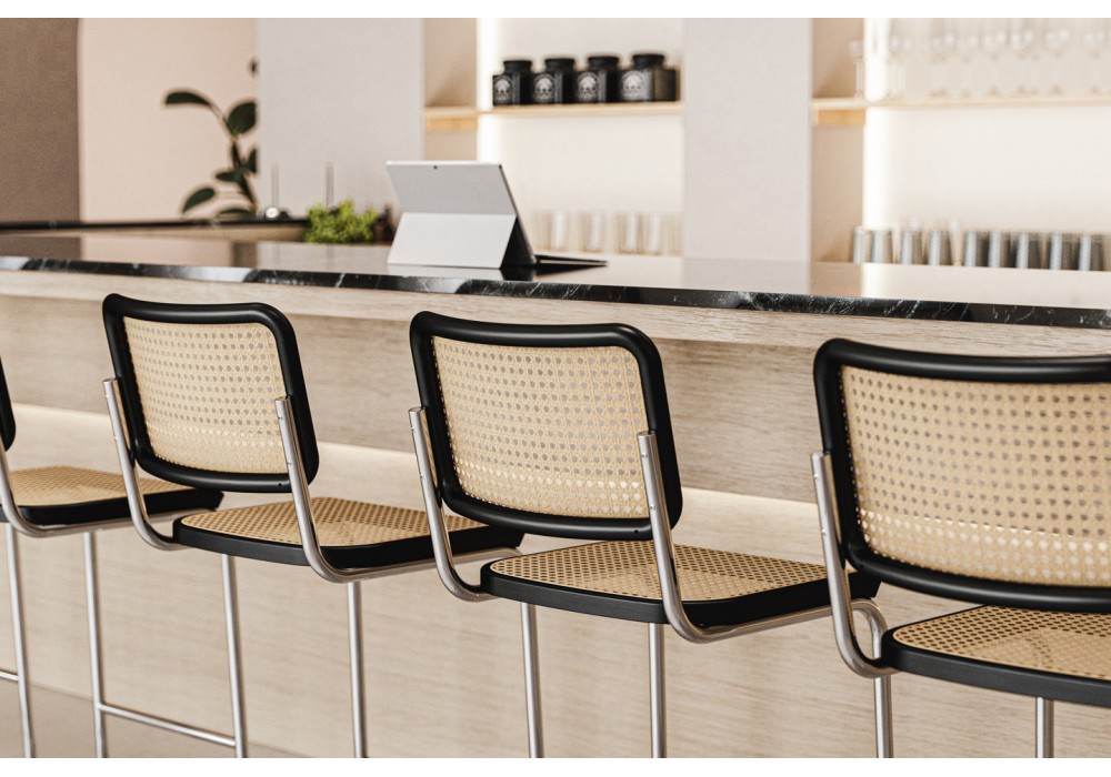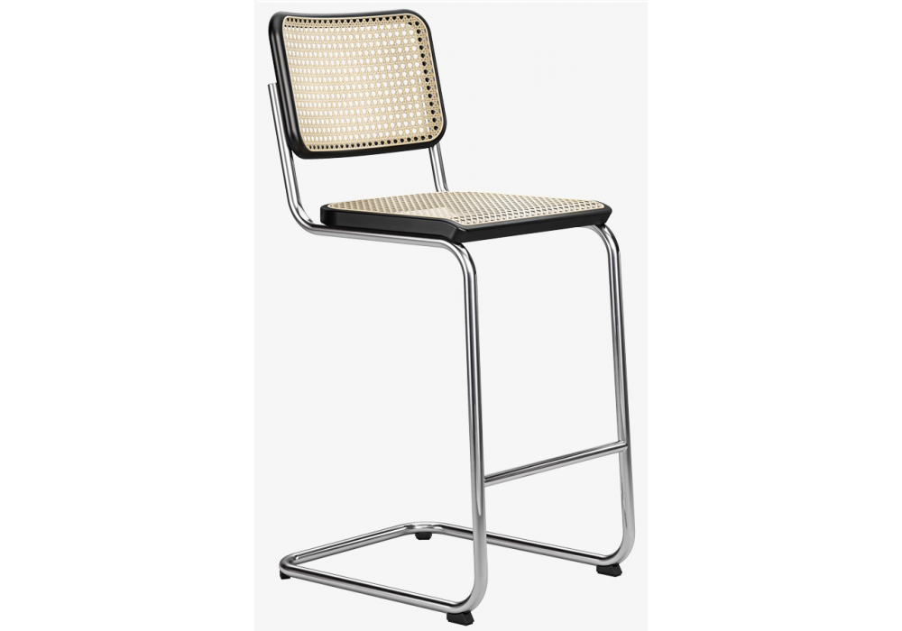 S 32 VH / VHT firmato da Marcel Breuer, Artistic copyright Mart Stam per Thonet è uno sgabello bar con struttura in tubolare d'acciaio e seduta / schienale in canna d'India. Disponibile anche in 2 altezze.