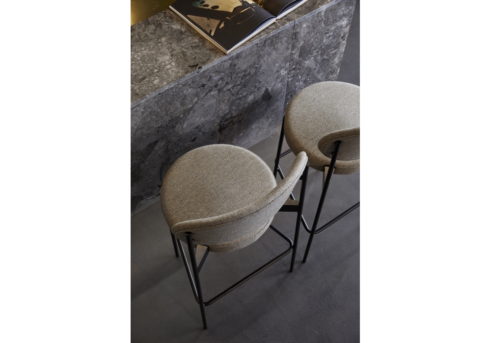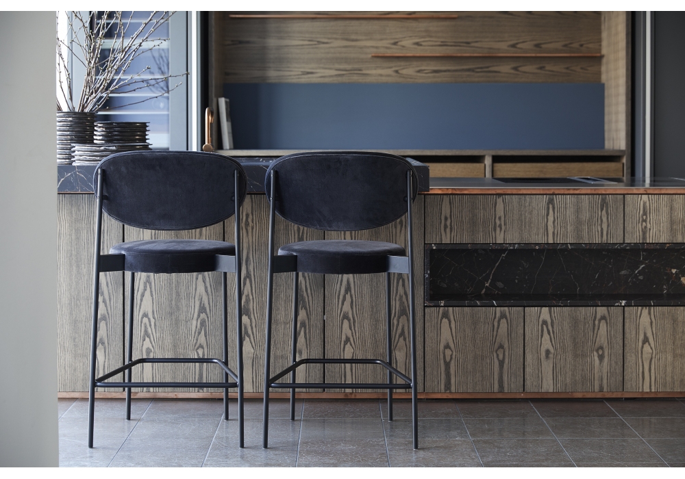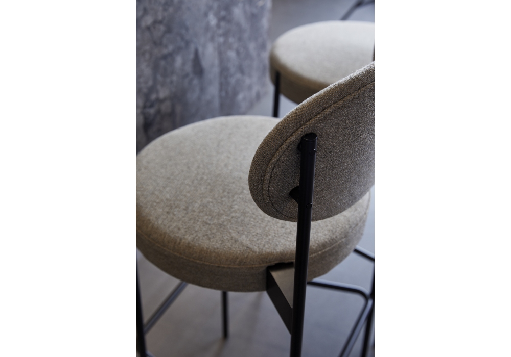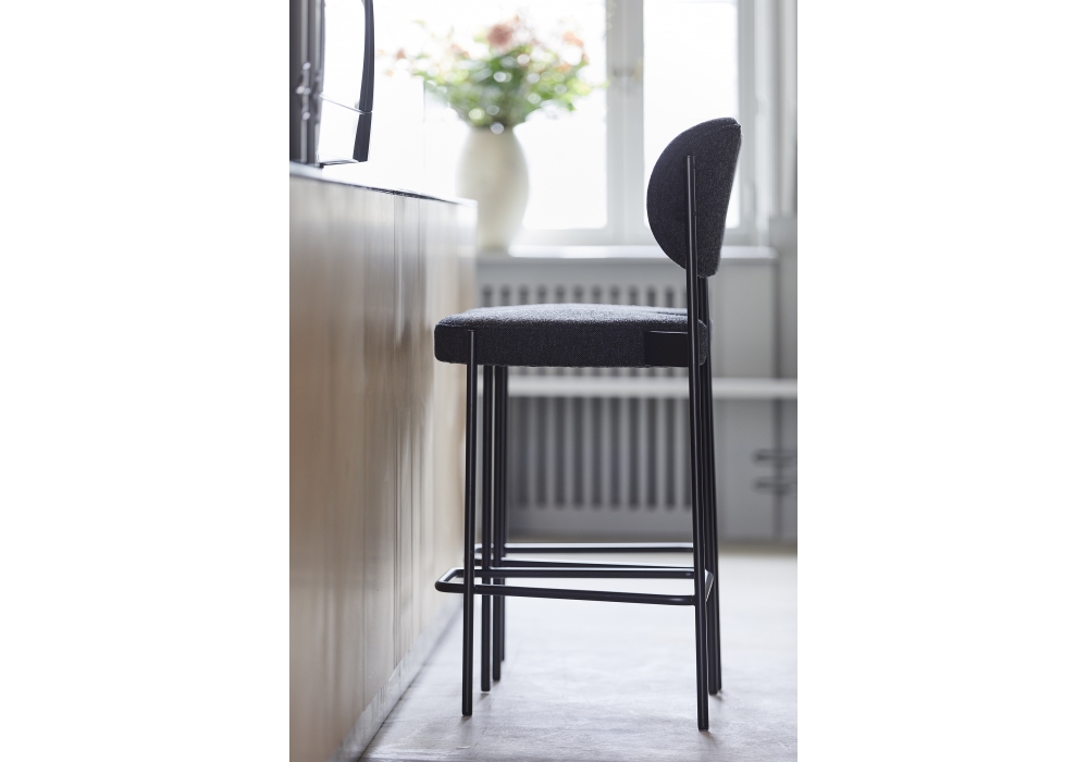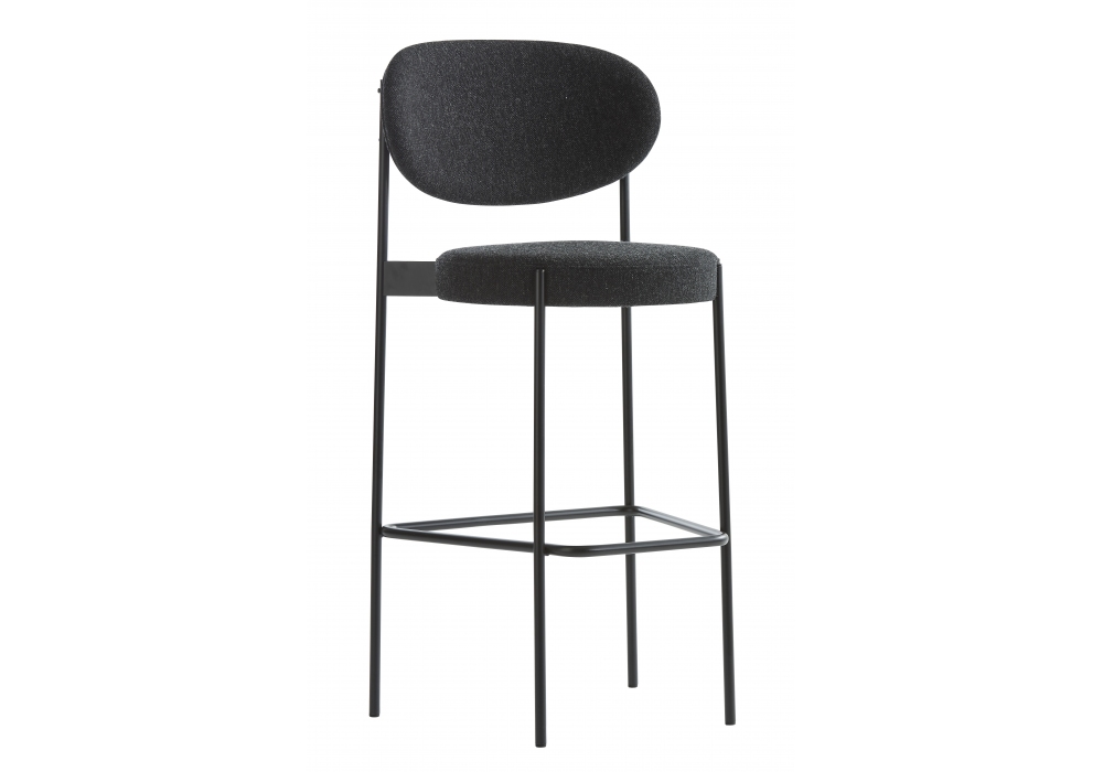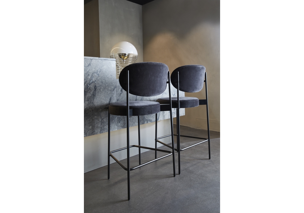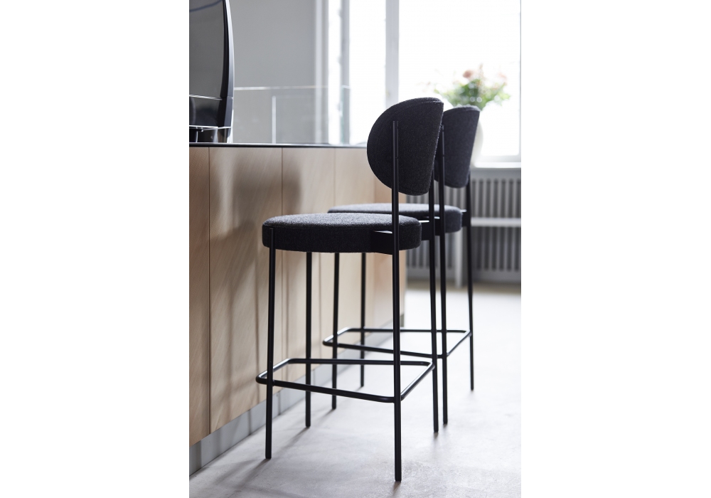 Series 430 firmata da Verner Panton per Verpan è un set di 2 sgabelli bar con struttura in metallo verniciato nero con piedini in feltro. Schienale e seduta completamente imbottiti e rivestiti in differenti tessuti o pelli. Disponibile in due dimensioni.