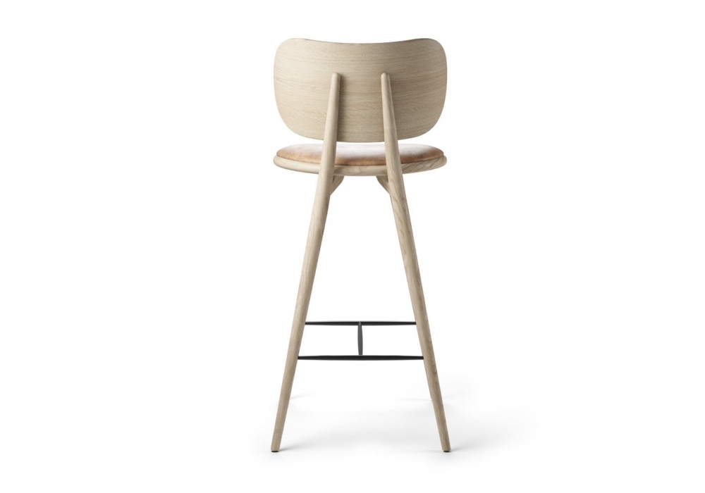 High Stool Backrest firmato da Space Copenhagen per Mater è uno sgabello realizzato con struttura in massello di rovere certificato FSC o faggio certificato FSC e seduta imbottita in pelle. È disponibile in diverse dimensioni e finiture.