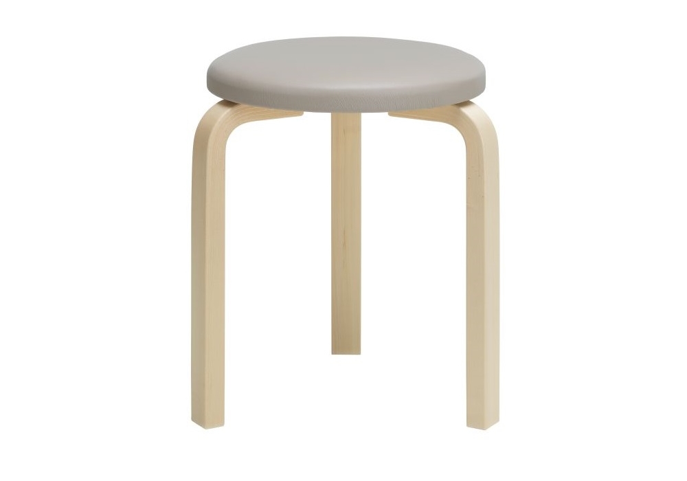 60 Stool firmato da Alvar Aalto per Artek è uno sgabello con seduta rivestita in tessuto o in pelle. Gambe in legno di betulla laccata o tinta. Disponibile in diverse finiture.