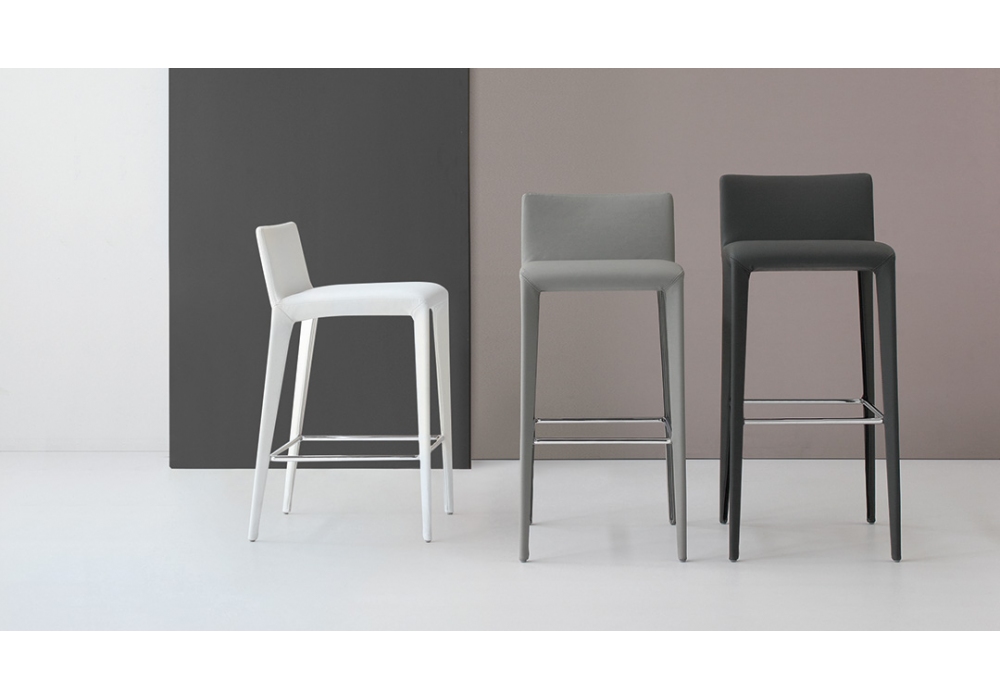 Filly Too firmato da Bartoli Design per Bonaldo è uno sgabello imbottito e interamente rivestito in tessuto, pelle o ecopelle. Disponibile in vari modelli. Le gambe sono disponibili nello stesso rivestimento della seduta o in metallo verniciato opaco.