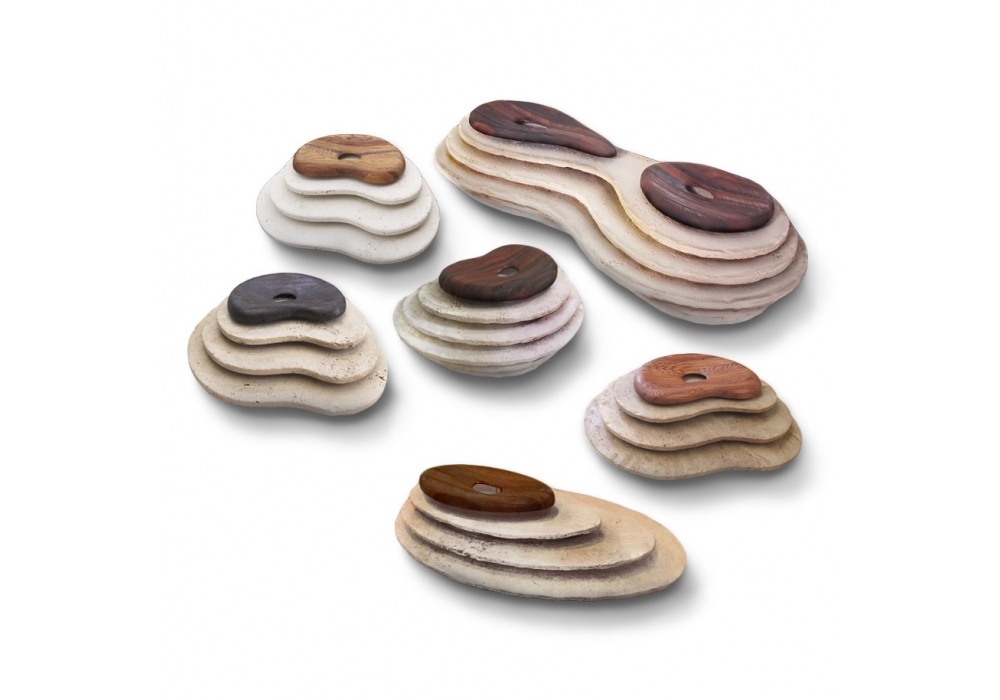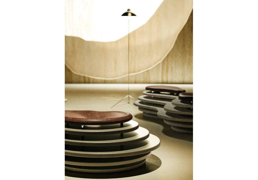 Oasi firmato da Enzo Berti per Kreoo è uno sgabello in marmo realizzato dalla sovrapposizione di più strati orizzontali di pietra naturale fissati tra loro da tubolari metallici disposti in verticale. Seduta in larice invecchiato. Disponibile in differenti modelli.