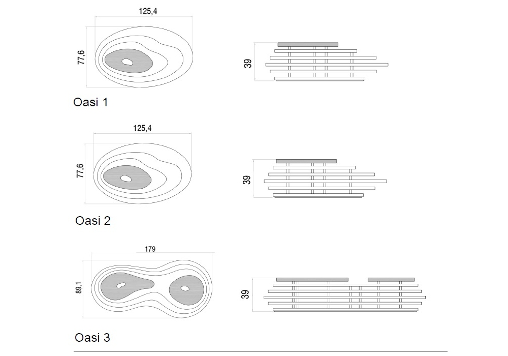 | Dimensioni | Oasi 1_ 110 x 90 x H 39 cm; Oasi 2_ 125 x 77 x H 39 cm; Oasi 3_ 180 x 90 x H 39 cm. |