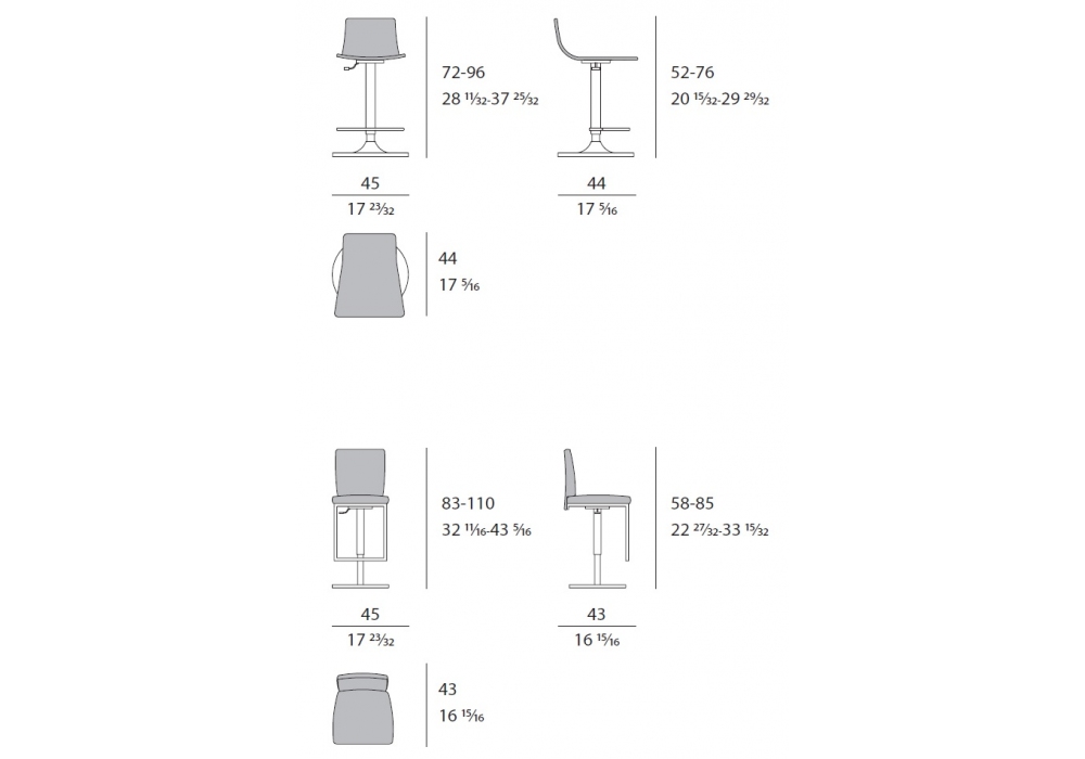 | Dimensioni | Ø 45 x H 72/96 cm; 42 x 43 x H 83/110 cm. |