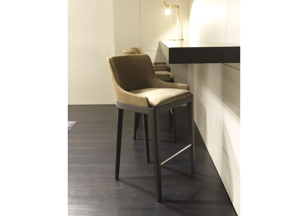 Cleò firmato da MisuraEmme è uno sgabello realizzato con base con lavorazione artigianale in massello di rovere tinto e sedile e schienale curvato imbottito e rivestito in tessuto o in pelle.