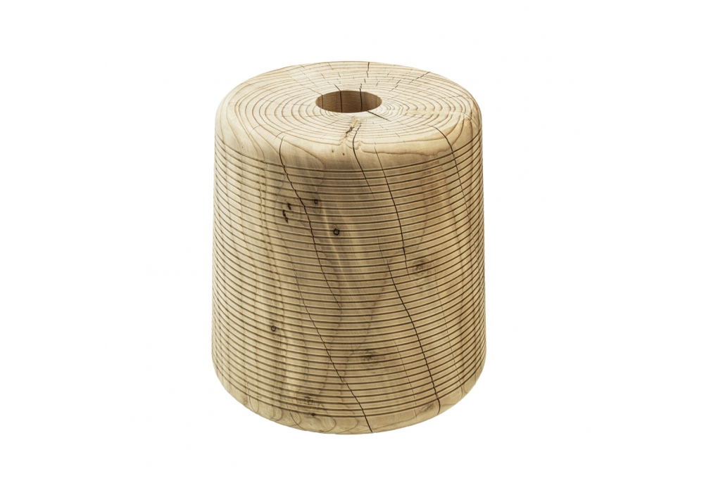 Rock-Etto firmato da C.R.&S. Riva1920 e Tecnologie D’impresa per Riva 1920 è uno sgabello in legno massello di cedro profumato lavorato da un blocco unico, riproduzione di un rocchetto la cui lavorazione superficiale ricorda il filo avvolto su di esso.