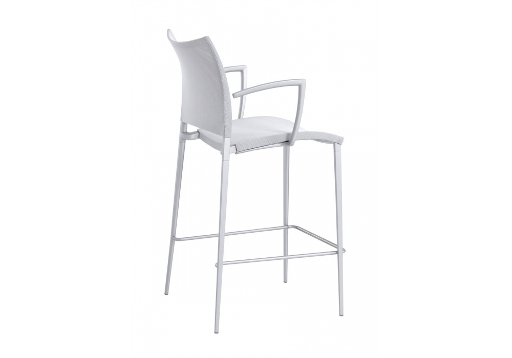 Sand Air firmato da Pocci e Dondoli per Desalto è uno sgabello con struttura in alluminio pressofuso, sedile e schienale in rete di poliestere rivestita in PVC (nella versione Canatex la rete è rivestita in PVC e canapa). Disponibile in diverse finiture e in due altezze con e senza braccioli.