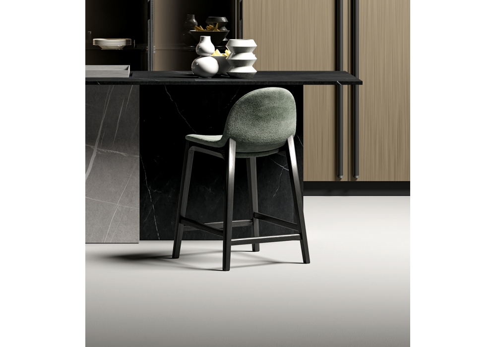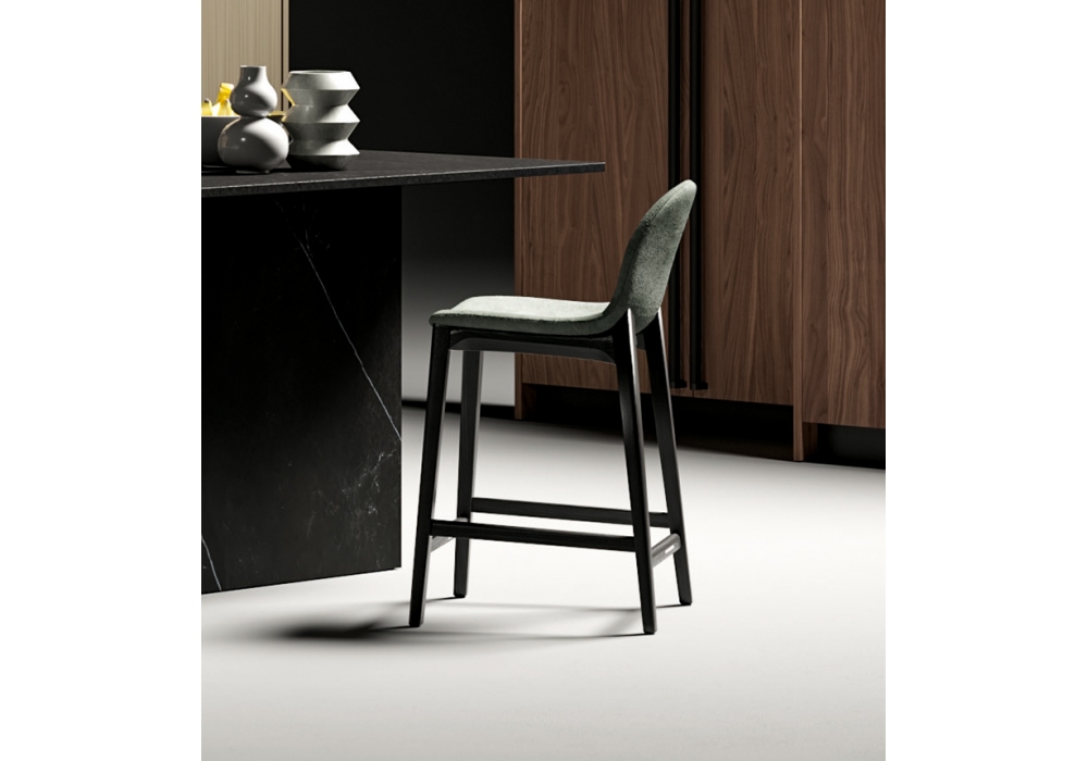 Hull firmato da Dall'Agnese è uno sgabello imbottito realizzato con struttura in legno e rivestimento in tessuto, pelle o ecopelle. Battitacco in legno con profilo cromo.