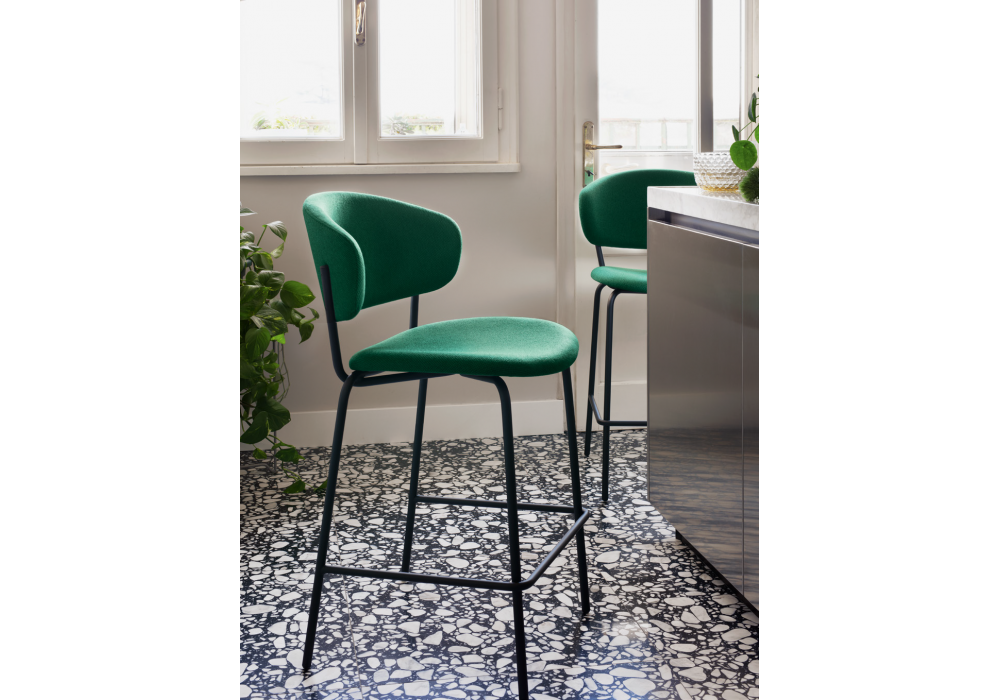 Desy firmato da Connubia è uno sgabello che presenta una struttura in metallo verniciato, seduta e schienale invece in tessuto o pelle. Disponibile in diverse finiture.