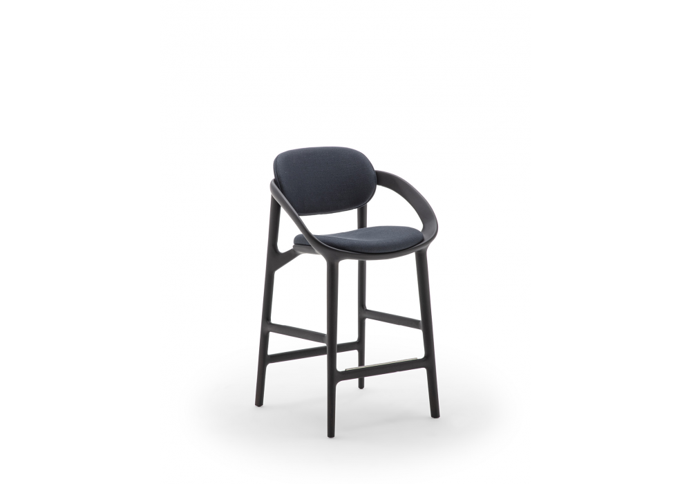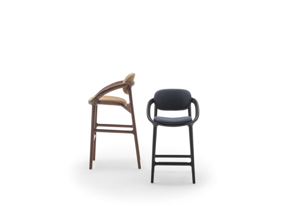 Molly firmato da Meneghello Paolelli per Porada è uno sgabello con struttura in massello di noce canaletta o rovere con cuscino di seduta e schienale rivestito in tessuto o in pelle. Traverso anteriore poggiapiedi con dettaglio in acciaio inox.