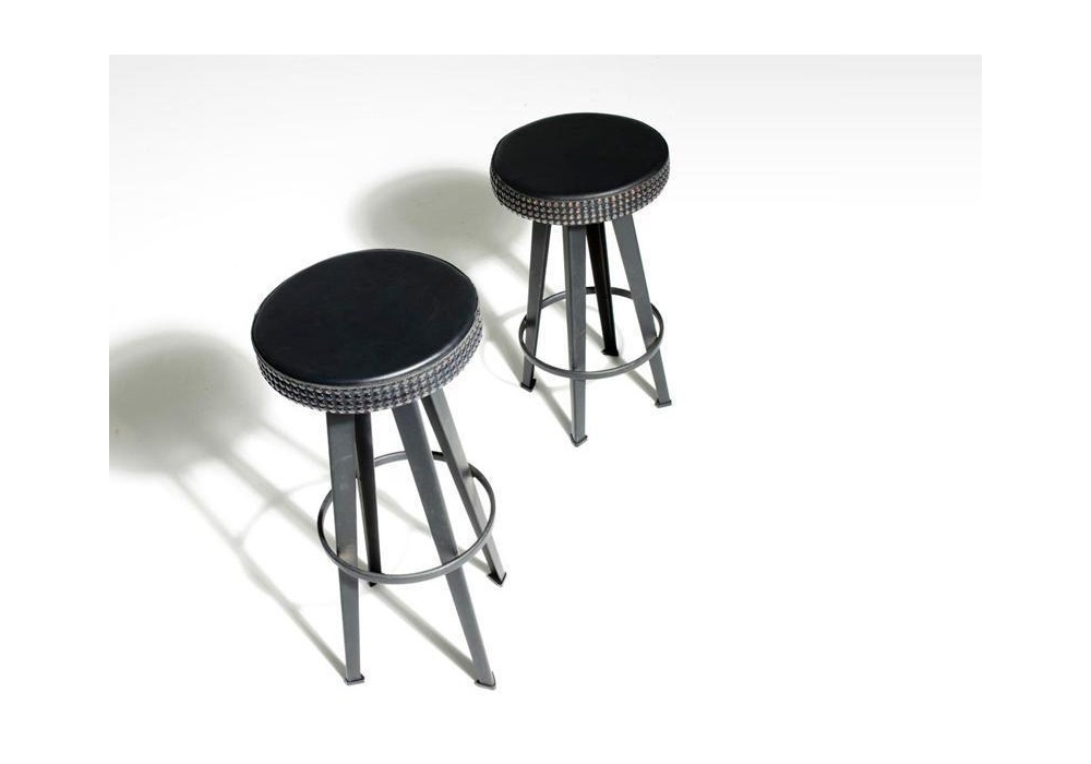 Bar Stud è una collezione di sgabelli firmata da Diesel with Moroso. Low e high Stool: sedile in legno rivestito con poliuretano espanso e pelle nera con o senza borchie. Basamento in acciaio. Sottopiedi in polipropilene.