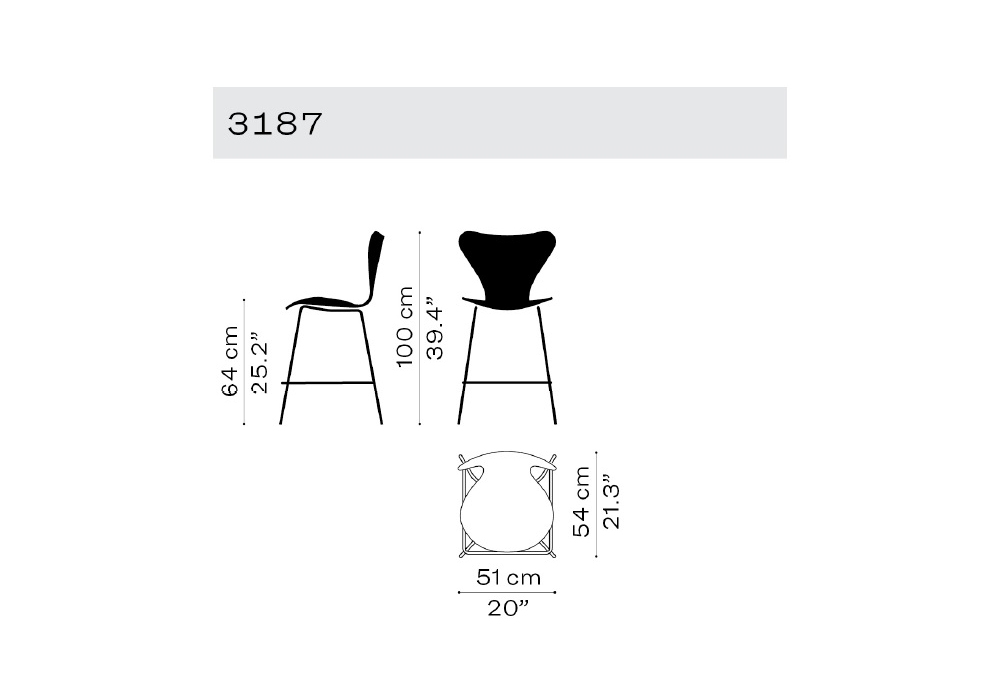 Series 7 Counter Stool firmato da Arne Jacobsen per Fritz Hansen è uno sgabello realizzato con scocca in legno impiallacciato o in frassino laccato o colorato e gambe in tubolare d'acciaio cromato o verniciato a polvere. Disponibile in diverse finiture.