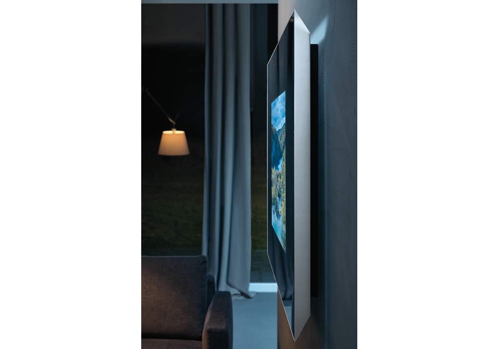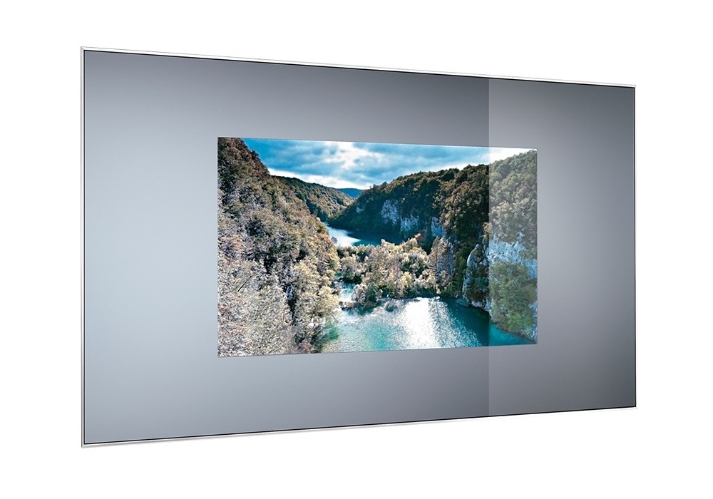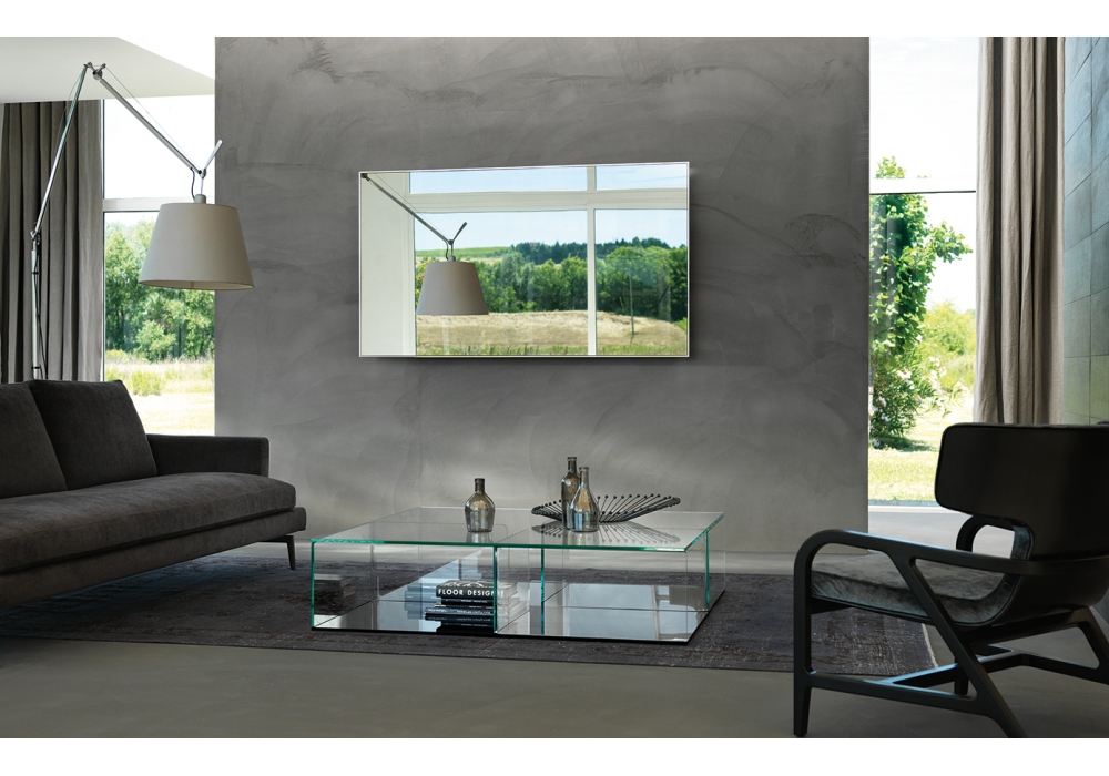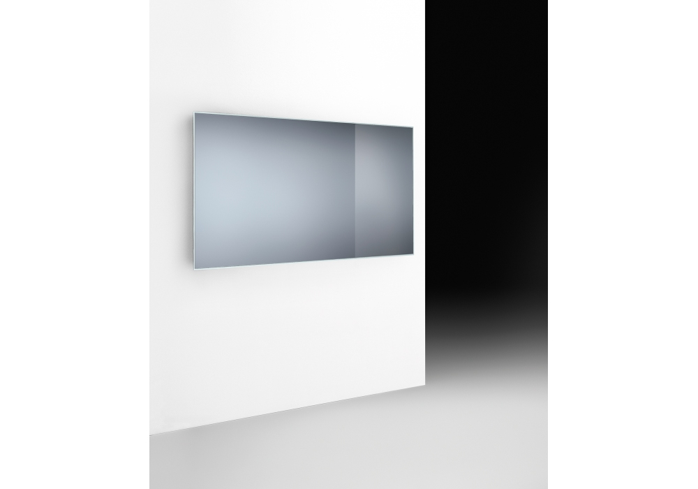Mirage TV firmato da Daniel Libeskind per Fiam è uno specchio da parete con alloggio per televisore realizzato in vetro semiriflettente color titanio con retrocornice in alluminio finitura brill. Telaio in metallo verniciato nero opaco.