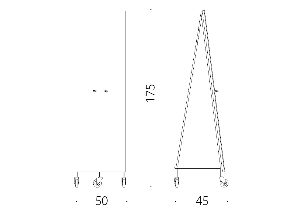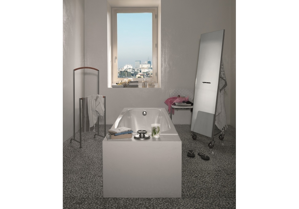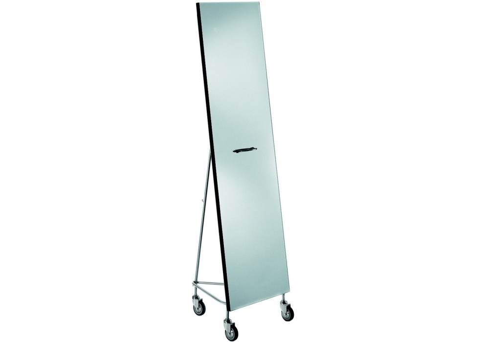 Narciso firmato da Enrico Franzolini per DePadova è uno specchio con struttura in acciaio color alluminio. Ruote industriali, due fisse e una piroettante, in gomma poliuretanica anti-olio con supporto in acciaio cromato.