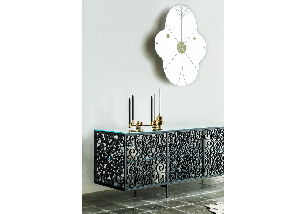 King Kong firmato da Jaime Hayon per BD Barcelona Design è uno specchio disponibile in due dimensioni con disegni applicati in oro e nero. Il retro degli specchi è di colore nero.