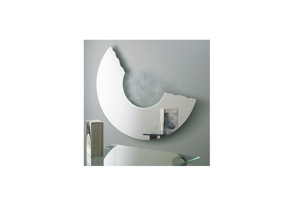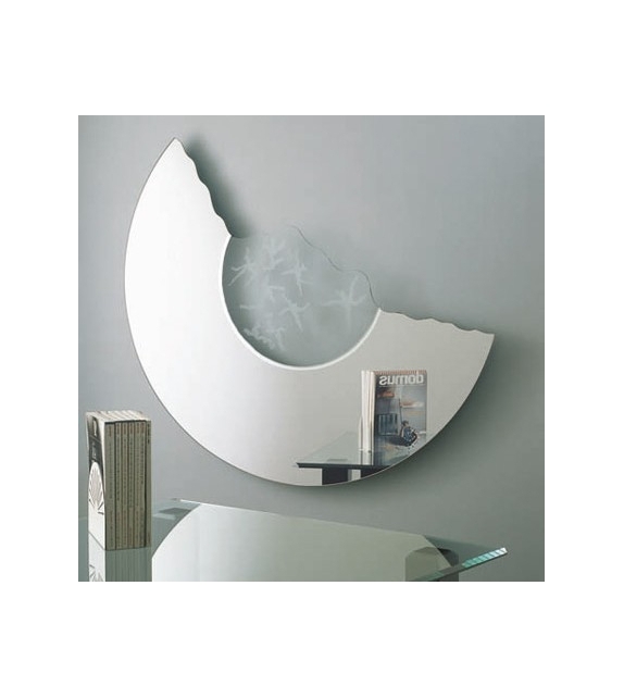 Scornice 06 firmato da Nanda Vigo per Glas Italia è uno specchio con motivo a cornice e decoro satinato sulla superficie trasparente, che ripete le rilfessioni del vetro. Una bisellatura incisa nello specchio sottolinea l'andamento della cornice.