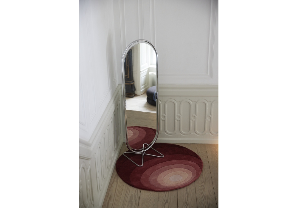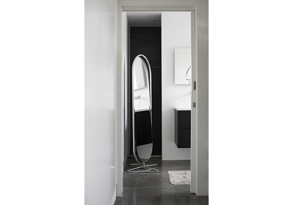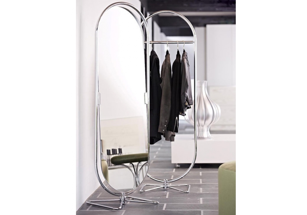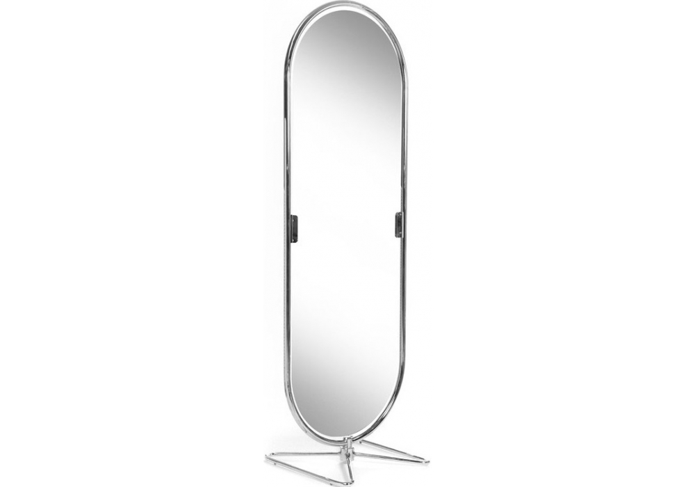 System 1-2-3 firmato da Verner Panton per Verpan è uno specchio montato su una struttura cromata ovale in acciaio con specchio a doppia faccia di 4 mm. Base in acciaio cromato a forma di farfalla. S'inclina e gira a 360 °.