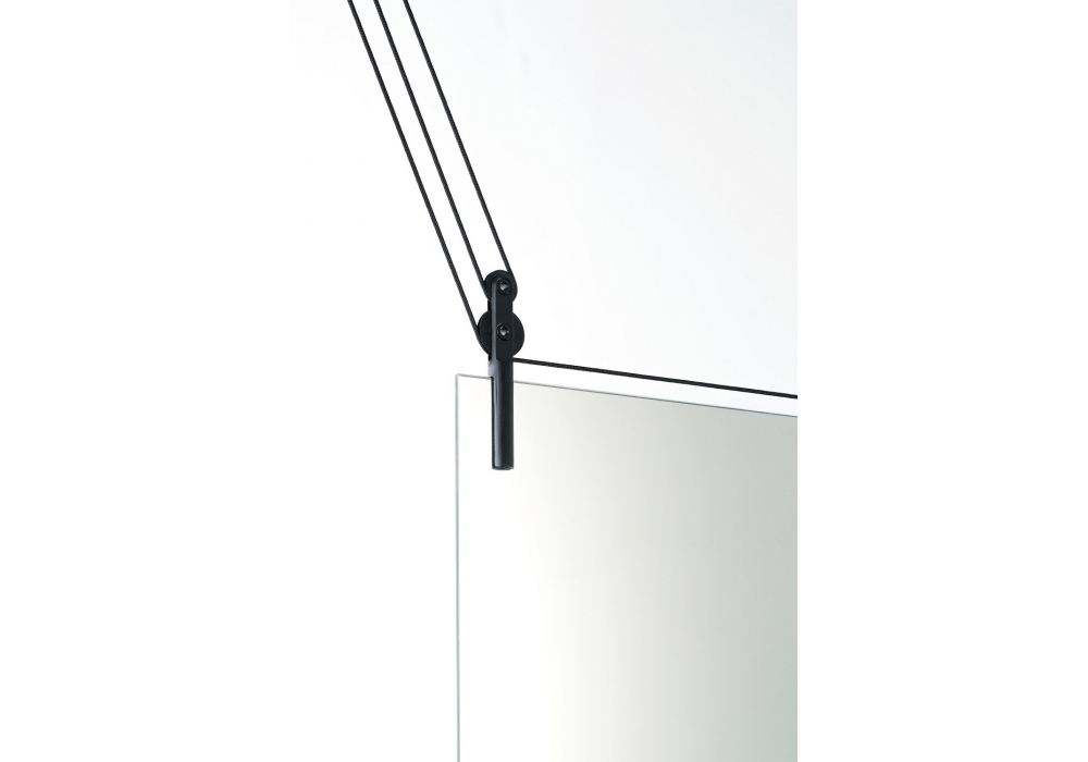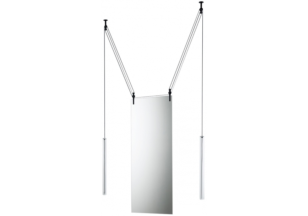 Palanco firmato da Ronan & Erwan Bouroullec per Glas Italia è uno spechio bifacciale da appendere a soffittto. É dotato di contrappesi, cavi e carrucole che ne consentono lo spostamento verticale. I contrappesi sono dei cilindri realizzati in vetro soffiato, mentre cavi e carrucole sono in alluminio nero. Grazie alla sua natura bifacciale, questo specchio si presta ad essere appeso in prossimità di una parete, ma anche al centro di un ambiente come elemento di divisione e schermatura.