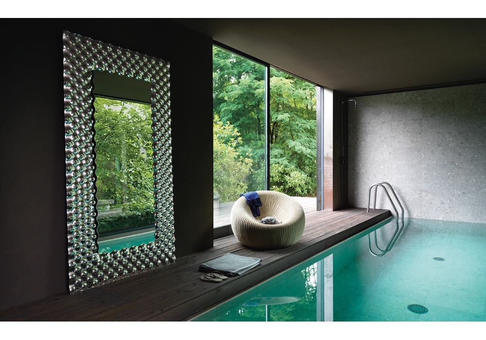 Pop firmato da Marcel Wanders per Fiam è uno specchio con cornice in vetro fuso a gran fuoco e telaio posteriore in metallo verniciato.