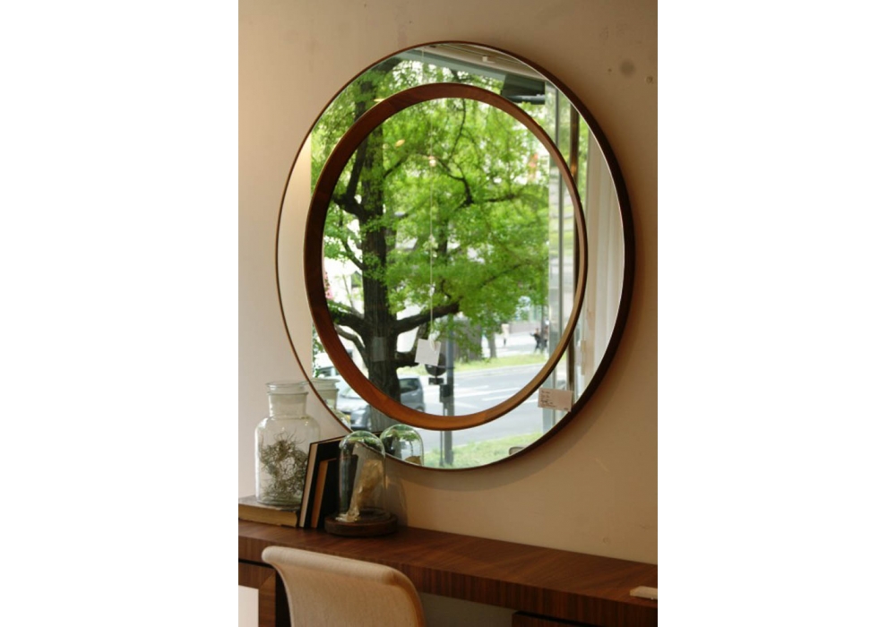 Miss Tondo firmato da T. Colzani per Porada è uno specchio tondo da parete con cornice in noce canaletta disponibile in 2 diverse finiture.
