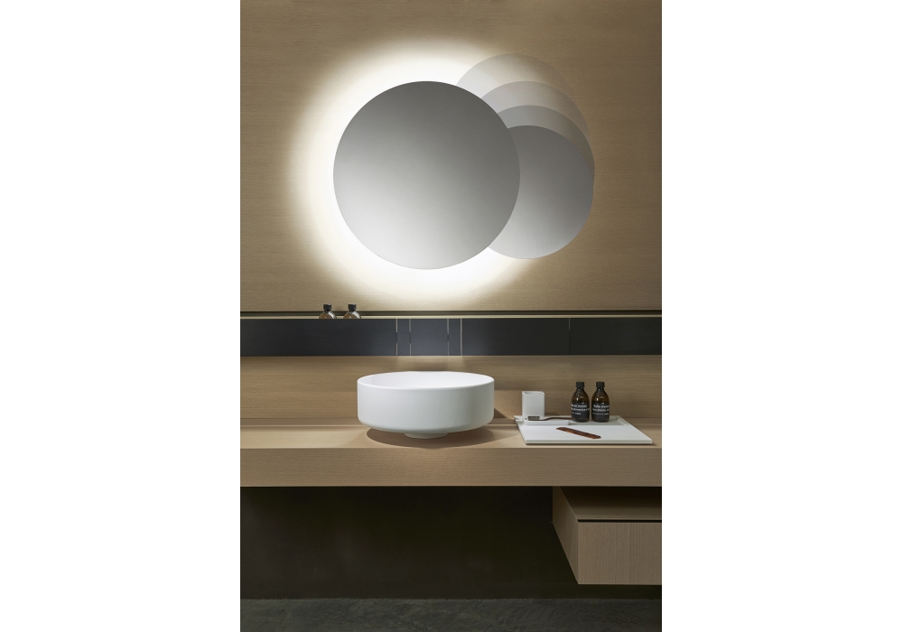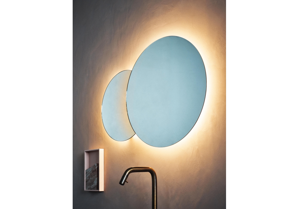 Eclissi firmato da Gergely Àgoston & Rd Agape per Agape è uno specchio composto da due parti circolari, una centrale fissa, dotata di luce a LED, e una laterale che può ruotare attorno all’elemento centrale. Entrambi gli specchi hanno bordi a filo lucido. Kit di fissaggio compreso. Lo specchio è fissato a parete con viti e tasselli ad espansione.