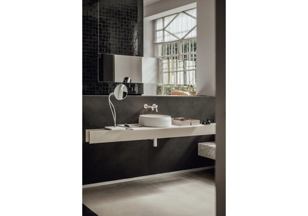 Insegna firmato da Benedini Associati per Agape è uno specchio rettangolare bifacciale con bordo a filo lucido, spessore 3+3 mm e pellicola di sicurezza. Lo specchio è sospeso al soffitto con cavi e supporti in acciaio inox. Disponibile in diverse dimensioni.