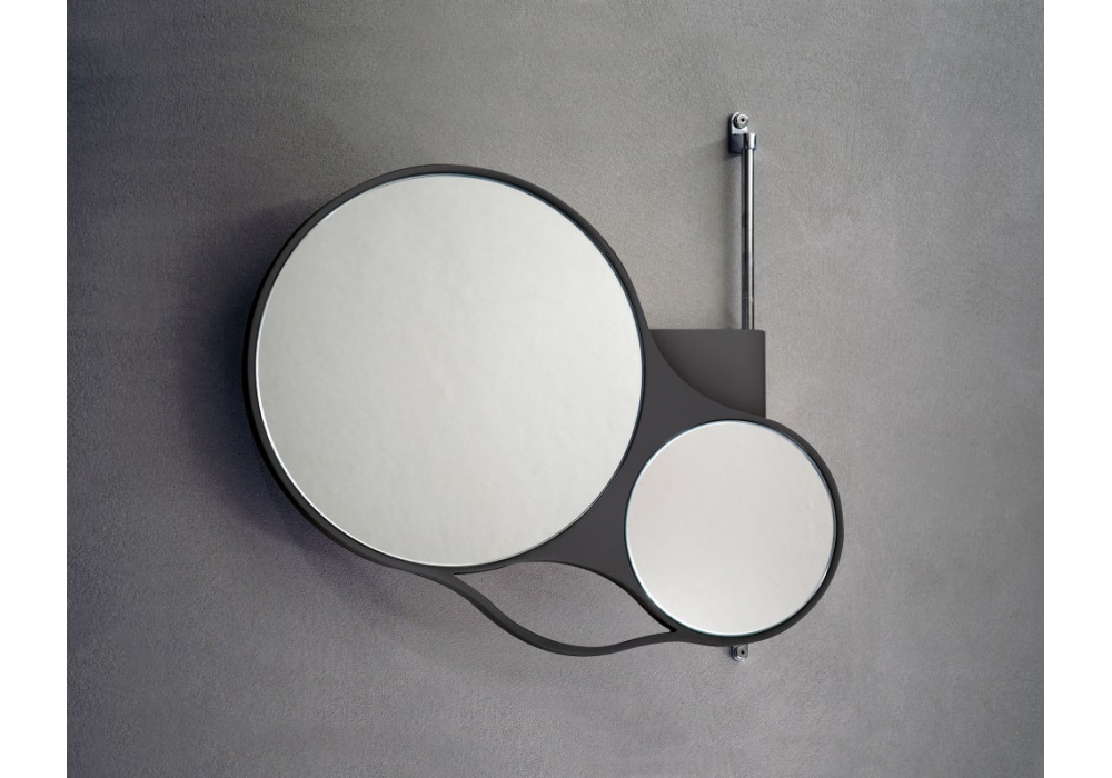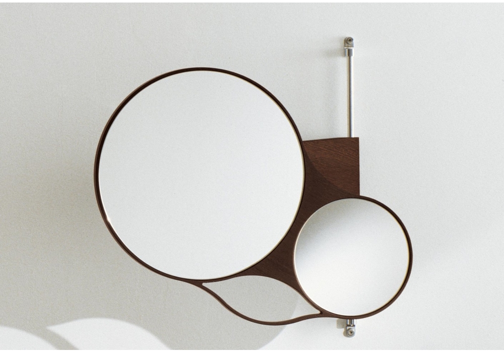 Spin firmato da Benedini Associati per Agape è uno specchio orientabile e regolabile in altezza, con struttura in multistrato di betulla in diverse finiture o verniciato in bianco o grigio; due superfici riflettenti, di cui una ingranditrice.