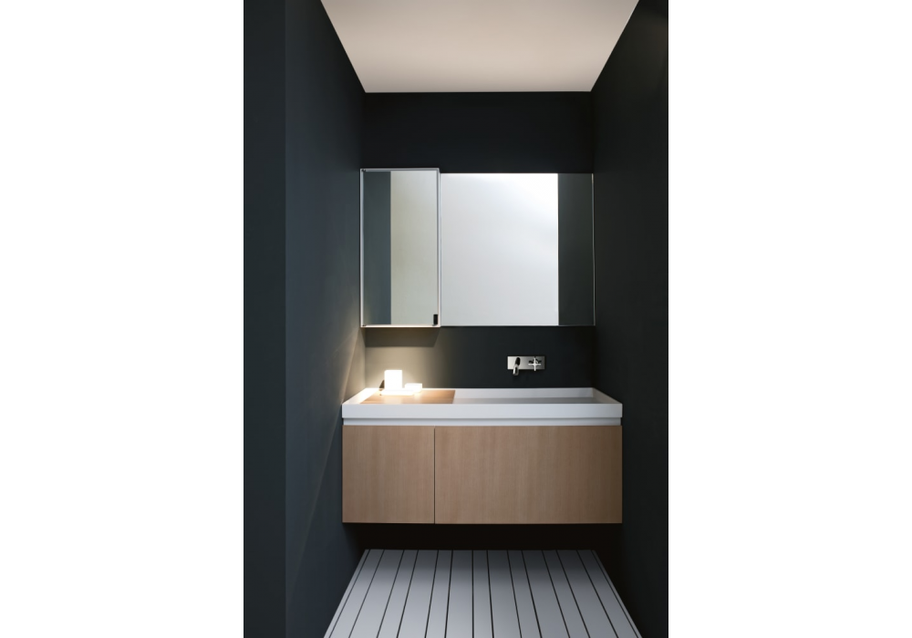 4x4 firmato da Benedini Associati per Agape è uno specchio contenitore con struttura in alluminio verniciato e anta a specchio bifacciale con bordo a filo lucido di spessore 3+3 mm. Tutti gli elementi possono essere installati indifferentemente con apertura a destra o a sinistra. La maniglia può essere posizionata in alto o in basso allo specchio.